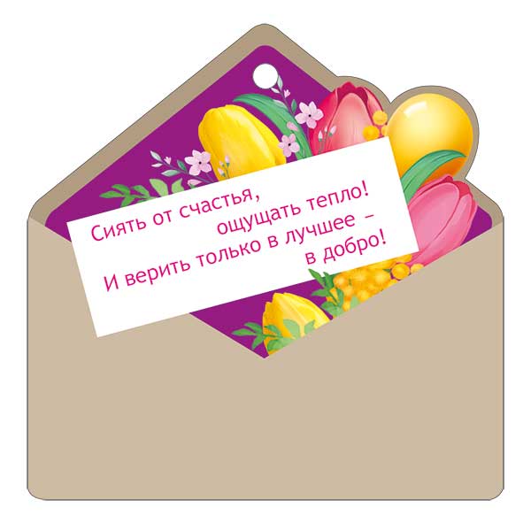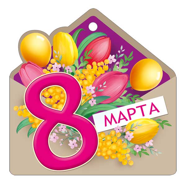 Бирка формата А7 предназначена для оформления подарков к 8 Марта и рассчитана на интенсивное использование в розничной и оптовой торговле. Изделие изготовлено из плотного картона, обеспечивающего стабильную геометрию при транспортировке, хранении и креплении к упаковке. Фигурная вырубка с верхним скошенным контуром и круглым отверстием позволяет быстро фиксировать бирку на лентах, шнурах, флористической проволоке или крафтовых пакетах, что удобно при массовой подготовке подарочных наборов, цветочных букетов и корпоративных сувениров. Габаритные размеры бирки 94 × 94 мм обеспечивают достаточную площадь для визуального восприятия рисунка и текста при сохранении компактности относительно стандартной подарочной упаковки. Лицевая сторона оформлена полноцветным изображением конверта с букетом тюльпанов, мимозы и декоративных элементов, крупной цифрой «8» и текстом «МАРТА», что однозначно указывает на тематику праздника и позволяет использовать бирку как готовый поздравительный элемент без дополнительной персонализации. Наличие текста исключает необходимость отдельной открытки в ситуациях, когда важна скорость обслуживания потока покупателей. Поверхность дополнительно обработана глянцевым УФ-лаком, за счет чего изображение устойчиво к истиранию, выцветанию и кратковременному воздействию влаги, а также сохраняет яркость при длительной выкладке на витрине и в местах интенсивного контакта с руками. УФ-лак повышает жесткость верхнего слоя, что уменьшает риск появления заломов и потертостей при упаковке и пересылке тиражей в коробах. Обратная сторона остается пригодной для краткой подписи от руки при использовании стандартных шариковых или гелевых ручек. В упаковке 20 изделий, что удобно для планирования закупок, формирования серийных подарочных решений и оптимизации складских остатков в праздничный сезон.