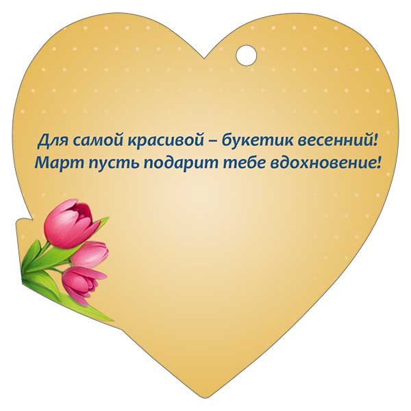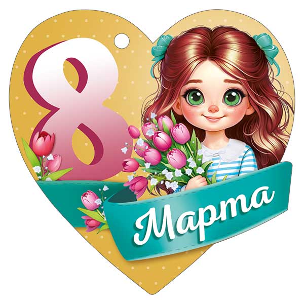 Бирка картонная формата А7 с фигурной вырубкой в виде сердца предназначена для оформления подарков и сувенирной продукции к 8 Марта в розничной и оптовой торговле. Готовое изделие имеет размеры 94 × 94 мм, что обеспечивает достаточную площадь для восприятия изображения и текста при компактных габаритах, удобных для транспортировки и хранения крупными партиями. Основа выполнена из плотного картона, устойчивого к изгибу и кратковременным механическим воздействиям, что снижает риск деформации при фасовке, перевозке и выкладке. Лицевая сторона содержит полноцветное изображение девочки с букетом тюльпанов и крупной надписью «8 Марта», дополненной декоративными элементами; присутствует готовый поздравительный текст, что позволяет использовать бирку без дополнительной персонализации или как дополнение к основному поздравлению. Нанесена глянцевая УФ-лакировка, повышающая износостойкость печати, устойчивость к истиранию и выцветанию, а также придающая изображению более четкий и насыщенный вид при освещении витрин и торговых залов. Конструкция предусматривает технологическое отверстие для крепления к упаковке подарка, цветам, коробкам, пакетам или декоративным композициям с помощью ленты, шпагата или тонкой проволоки, что удобно как для автоматизированной, так и для ручной упаковки. Бирка подходит для использования в цветочных салонах, магазинах подарков, супермаркетах и отделах сезонных товаров, а также для индивидуального применения при оформлении подарков в домашних условиях. Унифицированный праздничный дизайн ориентирован на женскую аудиторию разных возрастов и позволяет включать данную позицию в стандартный ассортимент к Международному женскому дню. В упаковке 20 штук, что оптимально для формирования полочного запаса, планирования закупок и распределения по торговым точкам.