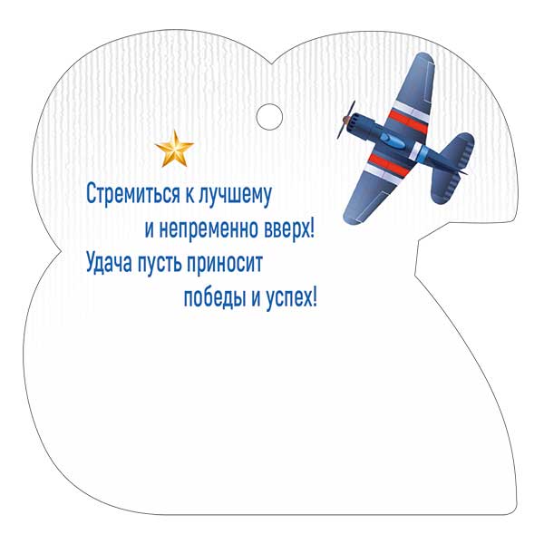 Бирка фигурной вырубки формата А7 выполнена из плотного картона и предназначена для оформления подарков и сувенирной продукции к 23 Февраля. Готовое изделие имеет размеры 95 × 94 мм, что удобно для размещения на коробках среднего и небольшого формата, пакетах, наборах и корпоративных подарках. Форма вырубки повторяет крупное числовое обозначение «23» с декоративным самолетом и надписью «Февраля», что обеспечивает узнаваемую тематическую стилистику и позволяет использовать бирку в единой концепции праздничного оформления. На верхней части предусмотрено технологическое отверстие под ленту, шнур или тонкую тесьму, благодаря чему бирка быстро крепится к упаковке без дополнительной фурнитуры и подходит для поточного оформления заказов. Печать выполнена с применением глянцевого УФ-лака, который придает изображению насыщенность и защищает поверхность от истирания, влаги и выгорания, что важно при транспортировке и хранении тиражей в складских условиях и при выкладке в торговом зале. Картон сохраняет жесткость, не деформируется при стандартной нагрузке и обеспечивает аккуратный внешний вид на протяжении всего срока использования. Наличие готового текста на лицевой стороне упрощает работу персонала при массовом оформлении подарков: бирка сразу выполняет роль небольшого поздравительного акцента, не требуя дополнительной подписи. В быту изделие может применяться для декорирования подарков членам семьи, коллегам, школьникам, а также для оформления классных уголков и праздничных инсталляций. Компактный размер и ровные края способствуют удобной транспортировке и складированию, бирки легко упаковываются стопками, не занимая много места. В одной упаковке — 20 штук, что позволяет планировать закупки с учетом серийного использования в розничных магазинах, компаниях, организациях и учебных заведениях.