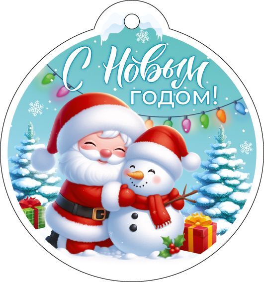 Бирка новогодняя фигурной вырубки формата А7 предназначена для оформления подарочной и сувенирной продукции, а также для использования в розничных и корпоративных новогодних наборах. Основа изделия выполнена из картона, что обеспечивает достаточную жесткость, устойчивость к сгибанию и сохранение формы при транспортировке и выкладке. Круглая форма с верхним выступом и технологическим отверстием позволяет быстро крепить бирку на ленты, шнуры, стяжки или стандартные упаковочные элементы без дополнительной подготовки. Габаритные размеры готового изделия: длина 87 мм, ширина 93 мм; такие параметры удобны для размещения на коробках среднего формата, пакетах, наборах кондитерских изделий и промо-наборах, не перекрывая основную информацию о товаре. Лицевая сторона содержит полноцветное изображение с новогодним сюжетом (Дед Мороз, снеговик, елки, подарки) и текст «С Новым годом!», что делает бирку готовым к применению элементом праздничного оформления без необходимости дополнительной печати. Отделка без отделки, поверхность матовая, что снижает риск бликов при освещении витрин и позволяет при необходимости делать надписи от руки стандартными маркерами или шариковыми ручками. В упаковке 20 штук, что удобно для планирования оптовых закупок, формирования серийных наборов и равномерного распределения по торговым точкам. Бирка рассчитана на краткосрочное сезонное использование, сохраняет внешний вид при аккуратной эксплуатации, не требует специальных условий хранения, может транспортироваться в стандартных коробах и пакетах вместе с основной продукцией. Подходит для применения в магазинах подарков, сетевой рознице, интернет-торговле, а также для оформления корпоративных презентов, где важно единообразное визуальное решение и точное соблюдение размеров при массовой упаковке.