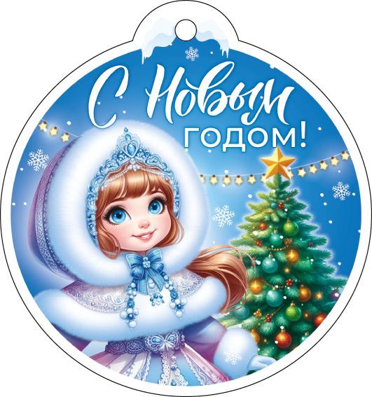 Бирка новогодняя круглой формы формата А7 изготовлена из плотного картона, рассчитанного на интенсивное использование в сезонных выкладках и при массовой упаковке подарков. Фигурная вырубка с верхним крепёжным отверстием обеспечивает готовность к подвесу на ленту, шпагат или стандартный шнур, что удобно при поточном оформлении подарочных наборов, сувенирной продукции и корпоративных презентов. Габариты готового изделия 87 × 93 мм позволяют размещать бирку на средних и крупных упаковках без перекрытия основной информации о товаре и при этом делать поздравительный акцент хорошо заметным. Лицевая сторона содержит полноцветное изображение в зимней тематике с персонажем в нарядной шубке на фоне украшенной ёлки и текстовым поздравлением «С Новым годом!», что делает изделие универсальным для использования в розничной и корпоративной среде, при оформлении детских подарков, наборов сладостей, промо-наборов и новогоднего декора. Материал обеспечивает достаточную жёсткость, бирка не деформируется при стандартных условиях транспортировки, удобна для укладки в коробки и стеллажное хранение, не занимает много места на складе. Обратная сторона подходит для нанесения краткой информации о получателе, номере заказа или внутренней маркировки, что важно при организации логистики и сортировки в оптовых партиях. Плотность картона и аккуратная вырубка по контуру снижают риск разрывов при подвесе и обеспечивают стабильный внешний вид на всём сроке эксплуатации в торговом зале или в процессе вручения подарков. В упаковке 20 штук, что удобно для планирования расхода при серийной упаковке и позволяет оперативно поддерживать единый стиль оформления новогодних предложений.