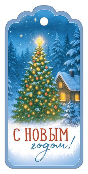 Бирка формата А7 изготовлена из плотного картона и рассчитана на интенсивное сезонное использование в розничной и оптовой торговле. Готовое изделие имеет размер 95 × 46 мм, фигурную вырубку с закруглённым контуром и технологическое отверстие под шнур, ленту или стяжку, что упрощает крепление к товарам, подарочным наборам, упаковке и сувенирной продукции. Лицевая сторона оформлена полноцветным новогодним изображением: зимний пейзаж с елью, украшенной гирляндами, и загородным домом на фоне заснеженного леса, в нижней части размещена надпись «С Новым годом!». Поверхность дополнительно обработана глянцевым УФ-лаком, который повышает износостойкость, устойчивость к истиранию и выцветанию, а также защищает краску от влаги при стандартных условиях хранения и транспортировки. Обратная сторона остаётся без печатного текста и может использоваться для нанесения ценника, штрихкода, служебной информации, личного поздравления или контактных данных; структура картона позволяет писать шариковой ручкой и маркером без растекания чернил. Конструкция бирки удобна для поточного оформления однородного ассортимента: компактный формат не перекрывает обзор товара, при этом остаётся достаточно места для учётной или поздравительной информации. Изделие поставляется по 20 штук, что облегчает планирование закупок для сетевой и сезонной розницы, новогодних ярмарок, интернет-магазинов и служб упаковки подарков. Бирки удобно хранить и транспортировать стопками, они не деформируются при аккуратном складировании, подходят для применения с большинством стандартных упаковочных материалов — пакетами, коробками, лентами и декоративным шпагатом, обеспечивая единый визуальный стиль новогоднего оформления.