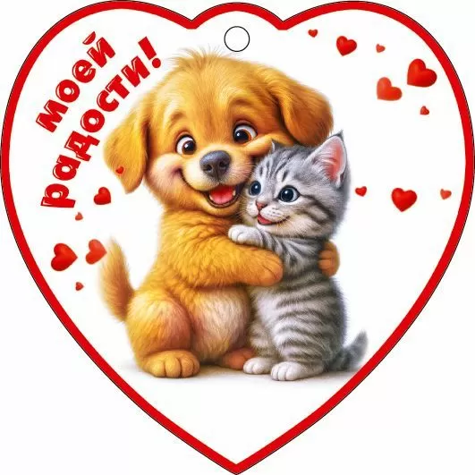 Бирка-сердечко «Моей радости!» – это стильное дополнение к любому подарку и милый знак внимания в честь Дня Святого Валентина. Очаровательный дизайн порадует всех! На сердечке изображены симпатичные щеночек с котенком в крепких объятиях. На обратной стороне мини-открыточки находится текст с теплыми и приятными словами. Качественные материалы производства и печати обеспечивают изделию прочность и долговечность. Дарите подарки с радостью!