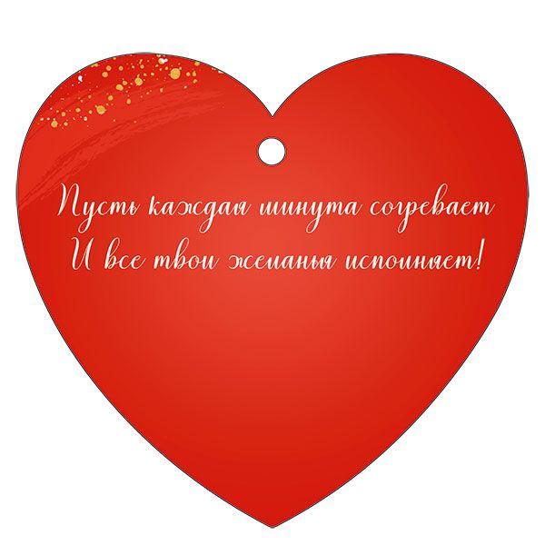 Бирка фигурной вырубки в форме сердца, формата А7, изготовлена из плотного картона и предназначена для оформления подарков, цветочных композиций и сувенирной продукции. Габариты готового изделия составляют 94 × 87 мм, что удобно для размещения на стандартных упаковках, букетах и коробках среднего размера, не перегружая композицию и оставаясь хорошо читаемым элементом. Лицевая сторона содержит полноцветное изображение красных роз на насыщенном красном фоне с декоративными золотистыми элементами и текстом «От всего сердца!», оборотная сторона также оформлена и поддерживает общую стилистику, что позволяет использовать бирку в качестве самостоятельного носителя поздравительного послания. В верхней части предусмотрено технологическое отверстие для крепления на ленту, шпагат, проволоку или декоративный шнур; диаметр отверстия подобран таким образом, чтобы бирка устойчиво фиксировалась при транспортировке и не рвалась по краю при аккуратном натяжении. Поверхность дополнительно обработана глянцевым УФ-лаком, что повышает износостойкость, устойчивость к истиранию, влаге и выцветанию, а также облегчает хранение и многократные погрузочно-разгрузочные операции в оптовых поставках. Плотный картон сохраняет форму при вертикальной подвеске и кратковременном контакте с упаковочными материалами, используется стандартная для полиграфической продукции толщина, совместимая с автоматическими и ручными операциями по навешиванию. Небольшой формат и фигурный контур оптимальны для выкладки в прикассовой зоне и на стойках с сопутствующими товарами; изделие удобно штабелируется и транспортируется в термоусадочной или коробочной упаковке, не требует специальных условий хранения, подходит для круглогодичной розничной продажи с акцентом на поздравительные поводы. В упаковке 20 штук, что обеспечивает удобный учет при оптовых закупках, формировании серийных подарочных наборов и планировании расхода на сезонные акции.