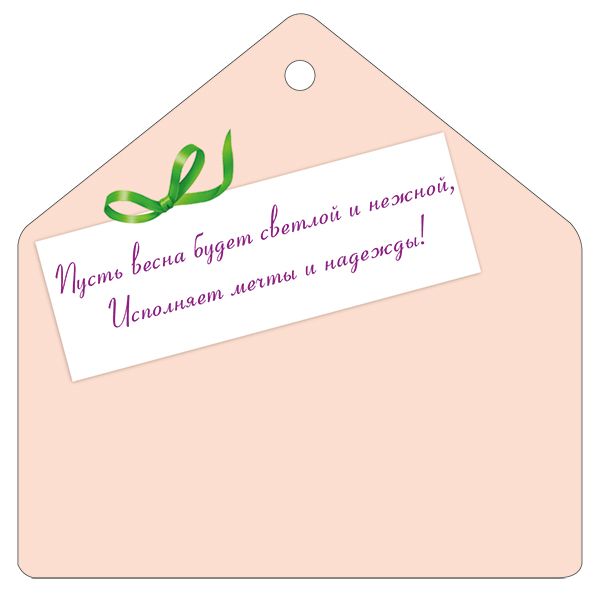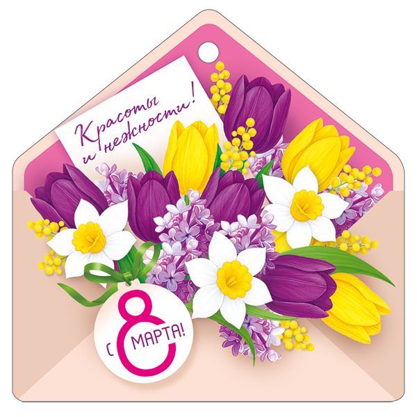 Бирка формата А7 изготовлена из плотного картона и предназначена для оформления подарков и сувенирной продукции к 8 Марта. Фигурная вырубка выполнена в форме открытого конверта с букетом весенних цветов, в верхней части предусмотрено технологическое отверстие для крепления на ленту, шпагат, тесьму или стандартный пластиковый держатель, что упрощает использование в розничной упаковке и при массовой предзаказной сборке. Готовое изделие имеет размеры 94 × 94 мм, что обеспечивает достаточную площадь для восприятия изображения и текста при сохранении компактности при транспортировке и хранении. Двусторонняя печать позволяет использовать лицевую сторону как декоративную, с иллюстрацией букета тюльпанов, нарциссов и мимозы и поздравительной надписью «Красоты и нежности!» и «С 8 Марта!», а оборотную — как информационную зону для указания цены, артикула, краткого послания или контактных данных дарителя и организации. Поверхность дополнительно обработана глянцевым УФ-лаком, что повышает стойкость к истиранию, выцветанию и кратковременному воздействию влаги, а также уменьшает риск загрязнения при частом касании в торговом зале или на складе. Картон сохраняет форму бирки при стандартных условиях эксплуатации, не деформируется при подвесе на тонкую нить или ленту и совместим с большинством типов упаковки: подарочные пакеты, коробки, цветочные композиции, корпоративные наборы. Конструкция удобна для потоковой работы: бирки легко штабелируются, не цепляются краями, занимают минимум места при хранении и перевозке, подходят для фасовки в термоусадочную пленку или коробки. Набор включает 20 изделий, что делает позицию удобной для планирования тиражей в розничных сетях, цветочных мастерских, сувенирных отделах и при подготовке корпоративных поздравлений, а конечному покупателю обеспечивает готовое решение для оформления индивидуальных подарков и букетов к Международному женскому дню.