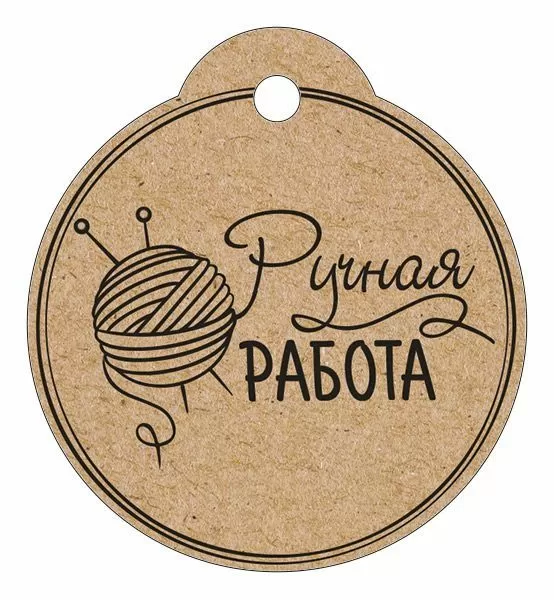 Круглая бирка «Ручная работа» с дизайном "под крафт". В комплекте 20 штук. Вверху каждой есть отверстие под ленточку или декоративный шнурок.