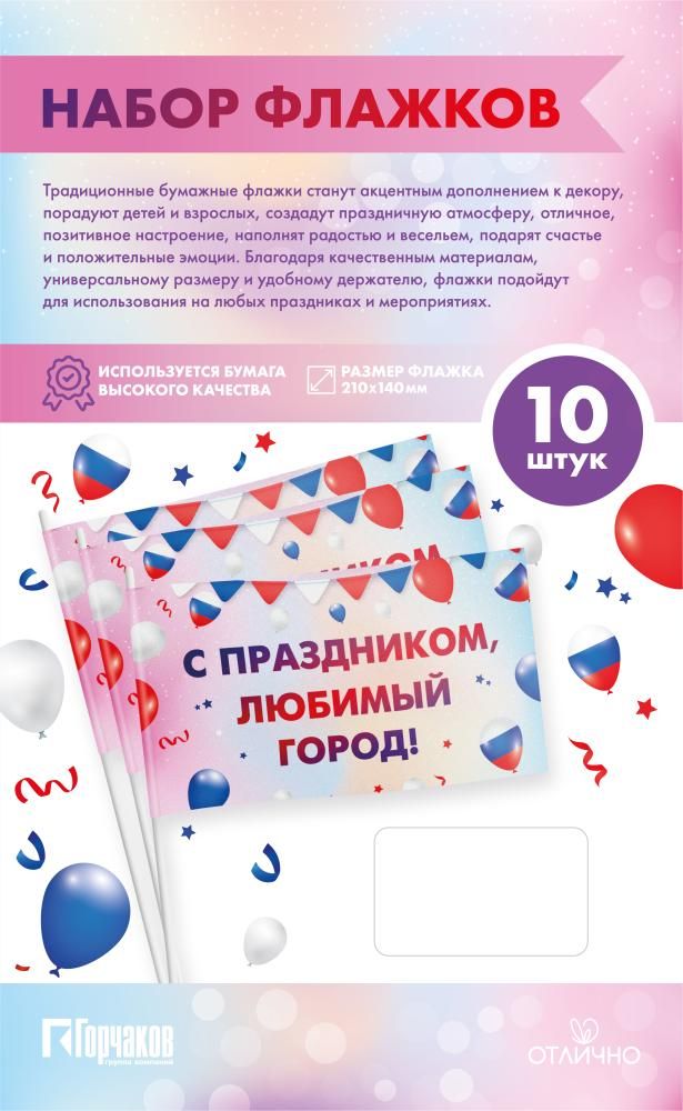 Набор флажков на палочке формата А3 предназначен для оформления городских и корпоративных мероприятий, массовых акций, праздничных шествий и точек продаж. Поле флажка выполнено из плотного картона с полноцветной двусторонней печатью: на лицевой стороне размещен крупный читаемый текст «С праздником, любимый город!» и праздничная графика с шарами и гирляндами в триколорной цветовой гамме, обеспечивающие хорошую видимость над толпой и на фотоснимках. Размер готового изделия 370 × 210 мм позволяет сочетать флажок с другой печатной продукцией стандартных форматов и удобно размещать в витринах, стойках регистрации, на ресепшен или в зонах входной группы. Жесткость картона поддерживает форму полотнища при активном размахивании и кратковременном воздействии влаги, что важно при уличных мероприятиях и длительных программах. Конструкция на палочке рассчитана на многократное использование в течение одного события, удобна для раздачи участникам и компактна при хранении: флажки можно укладывать стопой, транспортировать в коробах и фасовать по партиям для разных площадок. Отсутствие дополнительной отделки упрощает логистику, снижает риск повреждений при перевозке и делает изделие универсальным для сочетания с любым сценарием оформления — от городских праздников и дней поселка до школьных линеек и тематических программ в торговых центрах. Наличие готового текста исключает необходимость дополнительного дизайна и позволяет использовать набор сразу после поставки, в том числе в розничном сегменте для домашнего декора, небольших коллективных поздравлений и любительских мероприятий. Количество в упаковке 1.