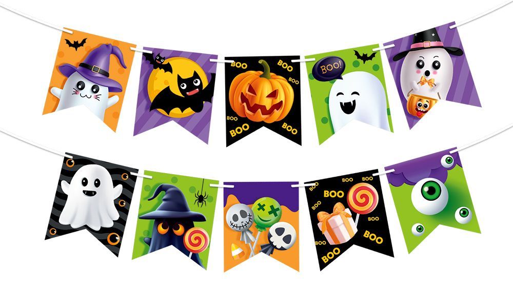 Гирлянда представляет собой декоративное изделие из плотного картона с полноцветной печатью, предназначенное для оформления интерьеров к праздникам в тематике Хэллоуина. Конструкция выполнена в виде ряда прямоугольных флажков с нижним V-образным вырезом, нанизанных на атласную ленту по всей длине. Длина готового изделия составляет 2000 мм, длина шнура также 2000 мм, что обеспечивает удобное размещение гирлянды вдоль стены, витрины, над входной группой или фотозоной; ширина каждого фрагмента около 114 мм позволяет формировать визуально плотную, хорошо читаемую композицию на расстоянии. Картонный материал устойчив к деформации, сохраняет форму флажков при многократном использовании, удобен при транспортировке и хранении в плоском виде, не требует специальных условий, что важно при оптовых поставках и складском хранении. Печать выполнена яркими контрастными цветами с изображениями персонажей и атрибутов Хэллоуина: привидений, тыкв, летучих мышей, ведьминых шляп, сладостей и стилизованных монстров; подобная графика подходит для оформления детских и семейных мероприятий, а также тематических акций в магазинах, кафе, развлекательных центрах и фотостудиях. Атласная лента служит одновременно несущим и декоративным элементом, не повреждает картон при аккуратном монтаже, обеспечивает равномерное распределение флажков и позволяет регулировать расстояние между ними в зависимости от ширины оформляемой поверхности. Изделие поставляется в количестве 1, что удобно для поштучного учета и формирования комплектов в ассортименте сезонного декора. Гирлянда не содержит текстовых надписей, за счет чего остается универсальной для использования в различных языковых средах и сценариях оформления, может комбинироваться с другими элементами декора без конфликтов по стилю и назначению, а также подходит для повторного применения из года в год при аккуратном обращении.