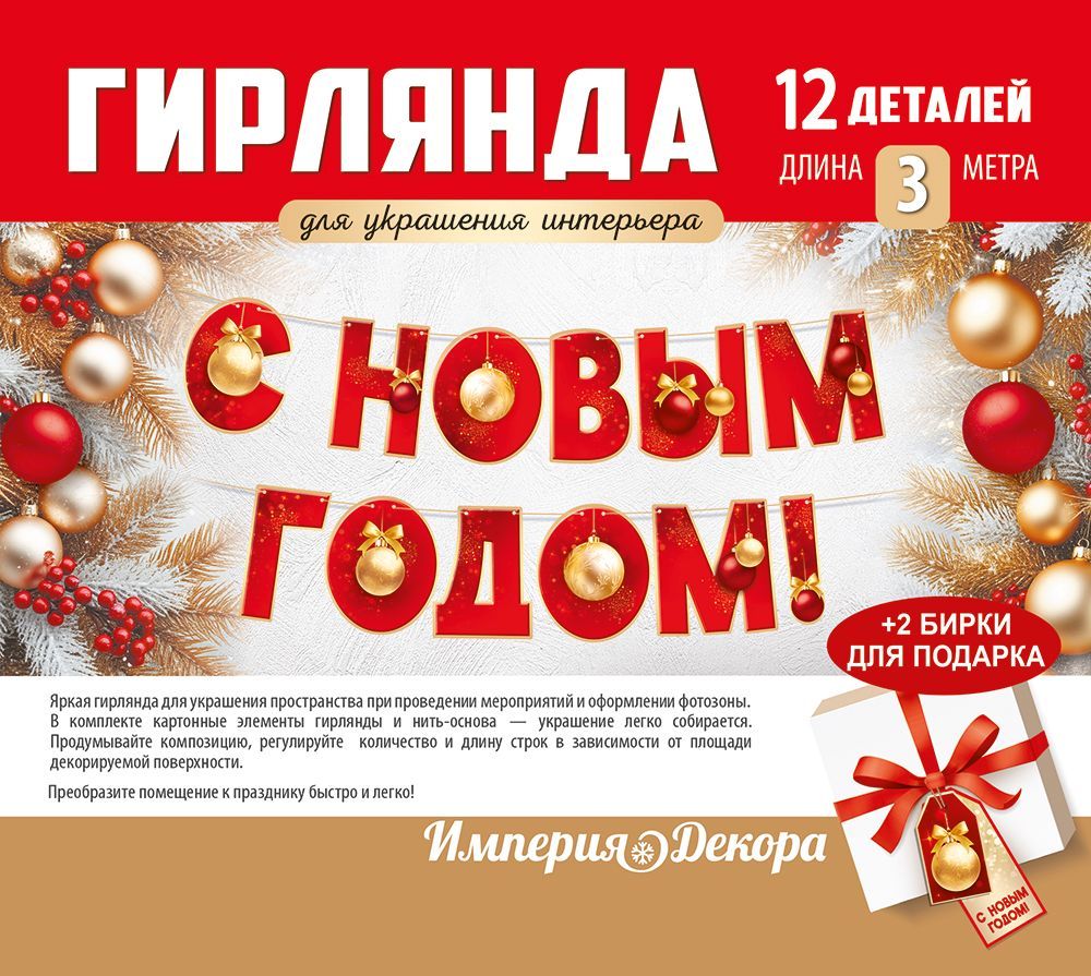 Гирлянда представляет собой готовое к использованию декоративное изделие для новогоднего оформления помещений. Конструкция состоит из 14 отдельных картонных элементов с фигурной вырубкой, формирующих надпись «С Новым годом!» и дополненных изображениями новогодних шаров. Элементы нанизаны на шнур длиной 3 000 мм, что позволяет растягивать гирлянду по прямой или с провисанием в зависимости от формата пространства. Длина готового изделия составляет 3 000 мм, максимальная ширина элемента — 185 мм, что обеспечивает хорошую читаемость надписи с расстояния и делает гирлянду заметной в витринной выкладке, на входной группе, ресепшене, в торговом зале или офисе. Материал основы — плотный картон, устойчивый к деформации при кратковременной транспортировке и хранении в сложенном виде; поверхность обладает декоративной отделкой с яркой цветопередачей, рассчитанной на использование в помещениях с искусственным и естественным освещением. Конструкция со шнуром в комплекте упрощает монтаж: элементы уже имеют отверстия для подвеса, допускается многократное использование при аккуратной эксплуатации. Для оптового покупателя важна стабильность размеров и состава: единица поставки содержит 1 гирлянду, что удобно при поштучном учёте, формировании наборов праздничного оформления и планировании выкладки сезонного ассортимента. Изделие компактно при упаковке, не требует специальных условий хранения, подходит для оформления магазинов, кафе, офисов, учебных заведений и жилых интерьеров в период новогодних мероприятий, легко комбинируется с другими бумажными и текстильными декоративными элементами схожей цветовой гаммы.