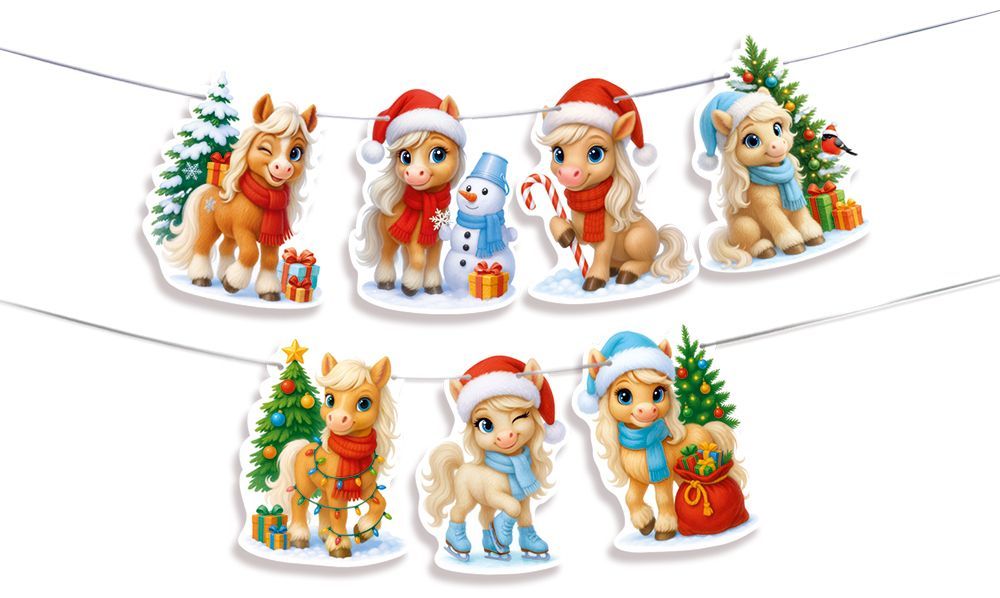 Гирлянда представляет собой декоративное подвесное изделие из картона с фигурной вырубкой, состоящее из 7 отдельных элементов на шнуре. Каждый элемент выполнен в виде новогодних персонажей‑пони в зимней тематике с подарками, елкой и снеговиком, без текстовой информации, что упрощает использование в любых языковых регионах и сценариях оформления. Готовое изделие имеет длину 1 500 мм при ориентировочной ширине одного элемента до 133 мм, что важно учитывать при планировании экспозиции и подборе сопутствующего декора. В комплект входит шнур длиной 1 500 мм, элементы уже подготовлены к нанизыванию, что сокращает время монтажа при массовом оформлении торговых залов, витрин, детских центров, офисов и праздничных площадок. Картон обладает достаточной плотностью для сохранения формы при подвесе, устойчив к кратковременным изгибам и не деформируется при аккуратной транспортировке и хранении в стандартных коробах; изделие рассчитано на многократное сезонное использование в помещениях. Печать полноцветная, с четкой прорисовкой деталей и яркими, но нейтральными по тематике зимними цветами, что позволяет сочетать гирлянду с другими новогодними и детскими коллекциями без визуального конфликта. Отсутствие дополнительной отделки облегчает уход за изделием, не требует специальных условий хранения и снижает риск повреждений при групповой упаковке. Количество в упаковке: 1. Формат и конструкция гирлянды удобны как для розничного использования в домашних интерьерах, детских комнатах и небольших мероприятиях, так и для оптовых закупок с последующим распределением по торговым точкам, где важны предсказуемые размеры, единообразный внешний вид и минимальные трудозатраты на установку.
