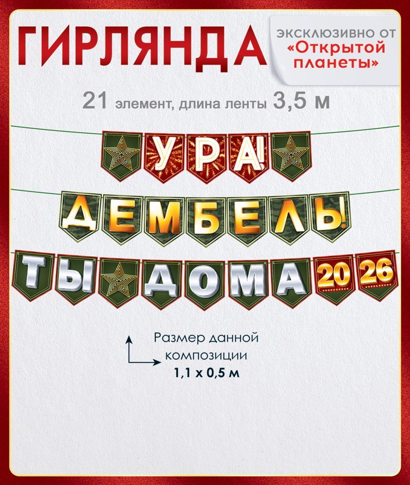 Гирлянда представляет собой готовое настенное декоративное изделие для оформления мероприятий, посвящённых возвращению из армии. Элементы выполнены из плотного картона, устойчивого к деформации при подвесе и многократном использовании, что важно при серийном применении в банкетных залах, домах офицеров, клубах и кафе. Комплект включает 21 элемент с печатным оформлением в военной тематике: на тёмно-зелёном фоне размещены крупные контрастные буквы и цифры «УРА! ДЕМБЕЛЬ! ТЫ ДОМА 2026», а также декоративные звёзды и салют, обеспечивающие хорошую читаемость надписи с расстояния и единый визуальный стиль. Общая длина готового изделия составляет 2600 мм при средней высоте элементов 144 мм, что позволяет использовать гирлянду как над столом, так и над входной зоной или сценой. Конструктивно элементы нанизаны на полипропиленовую ленту длиной 3500 мм, что даёт запас по краям для удобного крепления к стенам, колоннам, дверным проёмам или потолочным конструкциям с помощью скотча, кнопок или клипс. Полипропиленовая лента устойчива к растяжению и не боится кратковременного контакта с влагой, что облегчает монтаж и демонтаж, а также позволяет многократно использовать изделие в рамках сезонных мероприятий. Картонная основа имеет оптимальную толщину для сохранения формы при транспортировке и хранении в стеллажах или коробах, не требует сложной упаковки и подходит для отгрузки крупными партиями без значительного риска повреждений. В одной упаковке 1. Гирлянда может применяться как самостоятельный акцент в декоре или сочетаться с воздушными шарами, плакатами и другой праздничной атрибутикой, обеспечивая единообразие оформления и предсказуемый визуальный результат как для организаторов мероприятий, так и для частных покупателей.
