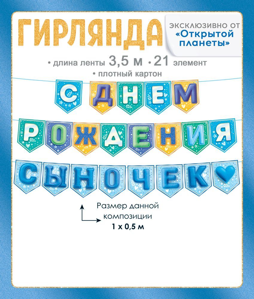 Гирлянда предназначена для оформления детских праздников и тематических мероприятий и представляет собой набор из 21 картонного элемента с буквами и символами, формирующими надпись «С ДНЕМ РОЖДЕНИЯ СЫНОЧЕК». Элементы выполнены из плотного картона, устойчивого к деформации при кратковременной транспортировке и многократном навешивании, что удобно для оптовых покупателей, ориентированных на повторное использование в декоре залов, детских комнат, фотозон и аниматорских программ. Поверхность имеет полноцветную печать с сочетанием голубых, синих, зелёных и жёлтых тонов и контрастных букв, что обеспечивает хорошую читаемость с расстояния и делает гирлянду универсальной для оформления помещений разного типа — квартир, кафе, детских центров, залов для мероприятий. Готовое изделие имеет длину 2600 мм при ширине одного элемента 144 мм, что позволяет заранее рассчитывать необходимое пространство на стене или над праздничным столом; общая длина шнура 3500 мм даёт запас для удобного крепления к стенам, стойкам или другим опорам. Конструкция с полипропиленовой лентой обеспечивает равномерное распределение нагрузки и фиксированное положение элементов, снижая риск разрывов в местах крепления и упрощая монтаж персоналу при серийном оформлении мероприятий. Материал ленты устойчив к растяжению и не боится кратковременного контакта с влагой, что важно при транспортировке и хранении на складах. Гирлянда поставляется в количестве 1, что позволяет гибко формировать ассортимент и выкладку: использовать изделие как самостоятельный декоративный элемент или комбинировать с шарами, растяжками и другими позициями для комплексного праздничного оформления. Компактное изделие удобно упаковывать, хранить и перевозить без значительных требований к складской площади, что снижает логистические издержки при оптовых закупках и обеспечивает стабильное наличие сезонного ассортимента.