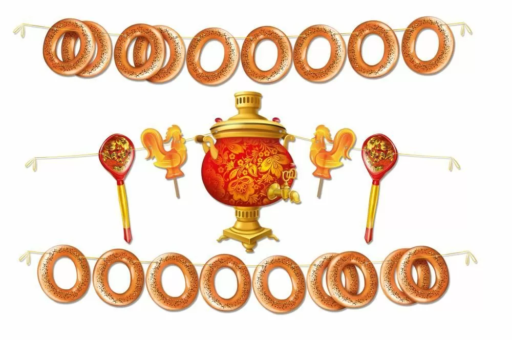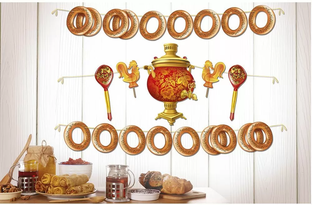 Оформительский набор с вырубными двусторонними плакатами на нитях. В комплект входят шнур для гирлянды и 19 мини-плакатов с изображениями баранок, деревянных ложек, карамельных петушков и самовара. Декор преобразит помещение к любому празднику и станет незаменимым оформлением столов с угощениями на Масленицу.