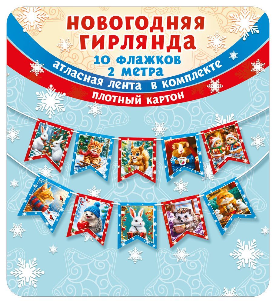 Гирлянда представляет собой набор картонных флажков с фигурной вырубкой в виде выемки по центру нижнего края, нанизанных на атласную ленту. Длина готового изделия и шнура составляет 2000 мм, что позволяет использовать гирлянду как самостоятельный элемент оформления небольших помещений, витрин и входных зон, а также комбинировать несколько изделий для декорирования протяжённых пространств. Ширина одного флажка около 114 мм, за счёт чего при стандартной длине достигается равномерное визуальное заполнение без перегрузки интерьера. Материал — плотный картон, устойчивый к деформации при вертикальной подвеске и кратковременном механическом воздействии, пригоден для многократного использования при аккуратном обращении и хранении в плоском виде. Изображения выполнены полноцветной печатью с новогодней тематикой и персонажами-животными, что делает изделие универсальным для оформления детских учреждений, торговых залов, развлекательных центров, кафе, а также домашнего интерьера в период зимних праздников. Отсутствие текста внутри позволяет использовать гирлянду в различных сценариях без привязки к конкретному событию или году, в том числе в составе комплексного праздничного оформления с другими декоративными элементами. Атласная лента служит одновременно несущим и декоративным элементом, обеспечивает удобство монтажа на крючки, скотч, декоративные держатели или стойки, а также позволяет при необходимости регулировать расстояние между флажками. Изделие поставляется по 1 штуке, удобно для поштучного учёта в оптовых поставках и формирования ассортимента по группам праздников; компактная упаковка способствует рациональному использованию складского пространства и снижению рисков повреждения при транспортировке.