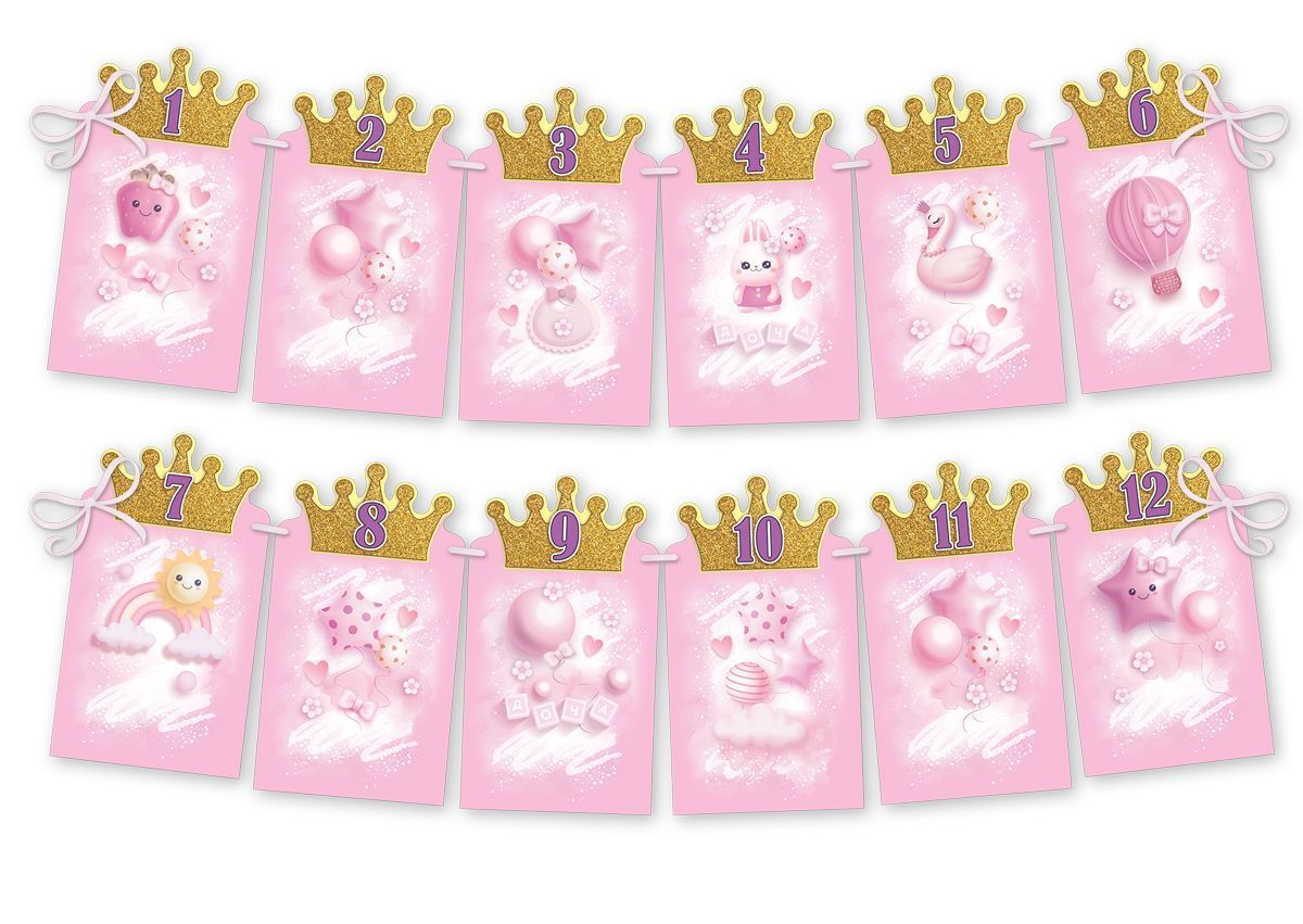 Гирлянда предназначена для оформления детского праздника и представляет собой набор из 12 картонных элементов на атласной ленте, рассчитанной на размещение вдоль стены, над столом или в фотозоне. Готовое изделие имеет длину 2500 мм при ширине элементов 240 мм, что удобно для стандартных помещений и позволяет заранее планировать схему декорирования при оптовых закупках. Элементы выполнены из плотного картона с двусторонним изображением и фигурной вырубкой в форме декоративных карточек с коронами, что обеспечивает аккуратный внешний вид как с фронтальной стороны, так и при обзоре под углом. Конструкция на подложке делает изделие более жёстким, уменьшает риск деформации при транспортировке и многократном использовании, а атласная лента служит одновременно несущим и декоративным элементом, позволяя равномерно распределять карточки по всей длине. Поверхность украшена глянцевым ВД-лаком, который придаёт изображению защитный слой, повышает стойкость к истиранию, выцветанию и загрязнениям, что важно для хранения на складе и повторного применения в сфере event-декора. Длина шнура 2500 мм обеспечивает достаточный запас для крепления к стенам, стойкам или другим опорам без дополнительного удлинения. Набор ориентирован на оформление празднования первого года жизни ребёнка: каждая из 12 деталей соответствует одному месяцу и имеет поле для размещения фотографии, что позволяет создать наглядную хронологию развития малыша и использовать гирлянду как элемент фотозоны. Отсутствие текста внутри делает изделие универсальным для частных мероприятий, фотостудий и организаций, предлагающих услуги по оформлению детских дней рождения, а также удобным для розничных покупателей, которым важно наглядно представить результат декорирования. Количество в упаковке: 1.