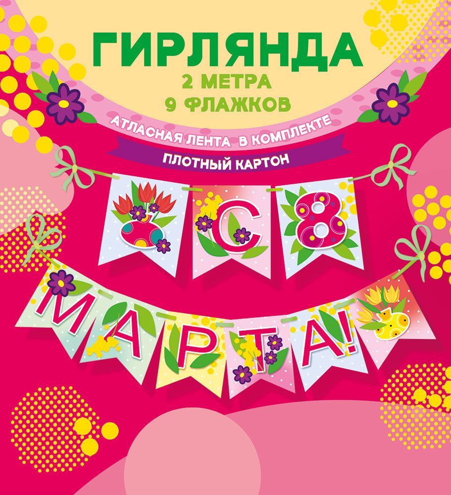 Гирлянда представляет собой готовое декоративное изделие для оформления помещений к празднику 8 Марта. Элементы гирлянды выполнены из плотного картона, обеспечивающего стабильную форму, устойчивость к деформации и сохранение яркости печати при краткосрочной сезонной эксплуатации. На отдельных флажках размещена надпись «С 8 МАРТА!» с крупными буквами и цифрой, дополненная графическими изображениями цветов и весенних мотивов; контрастные цвета хорошо читаются на расстоянии и подходят для оформления классов, офисов, торговых залов и витрин. Конструктивно изделие собрано на атласной ленте длиной 2 000 мм, что позволяет равномерно распределять флажки по всей длине и при необходимости регулировать расстояние между ними. Габаритные размеры готового изделия составляют: длина 2 000 мм, ширина флажков до 114 мм, что удобно для размещения гирлянды над доской, дверным проемом, витринным окном либо вдоль стены. Картонные элементы имеют гладкую поверхность, не требуют дополнительной отделки и готовы к использованию сразу после распаковки; материал совместим с типовыми условиями хранения сезонного декора на складе и в торговой точке, не занимает много места при транспортировке и может храниться в плоском виде. Конструкция на ленте допускает многократное аккуратное использование при бережном обращении, что важно для организаций, планирующих ежегодное оформление. Гирлянда подходит для оптовых закупок как универсальный позиционный товар весеннего ассортимента: единый размер, стандартная длина, нейтральная праздничная тематика и единица фасовки 1 обеспечивают удобство планирования выкладки и формирования сезонных предложений для конечных покупателей.