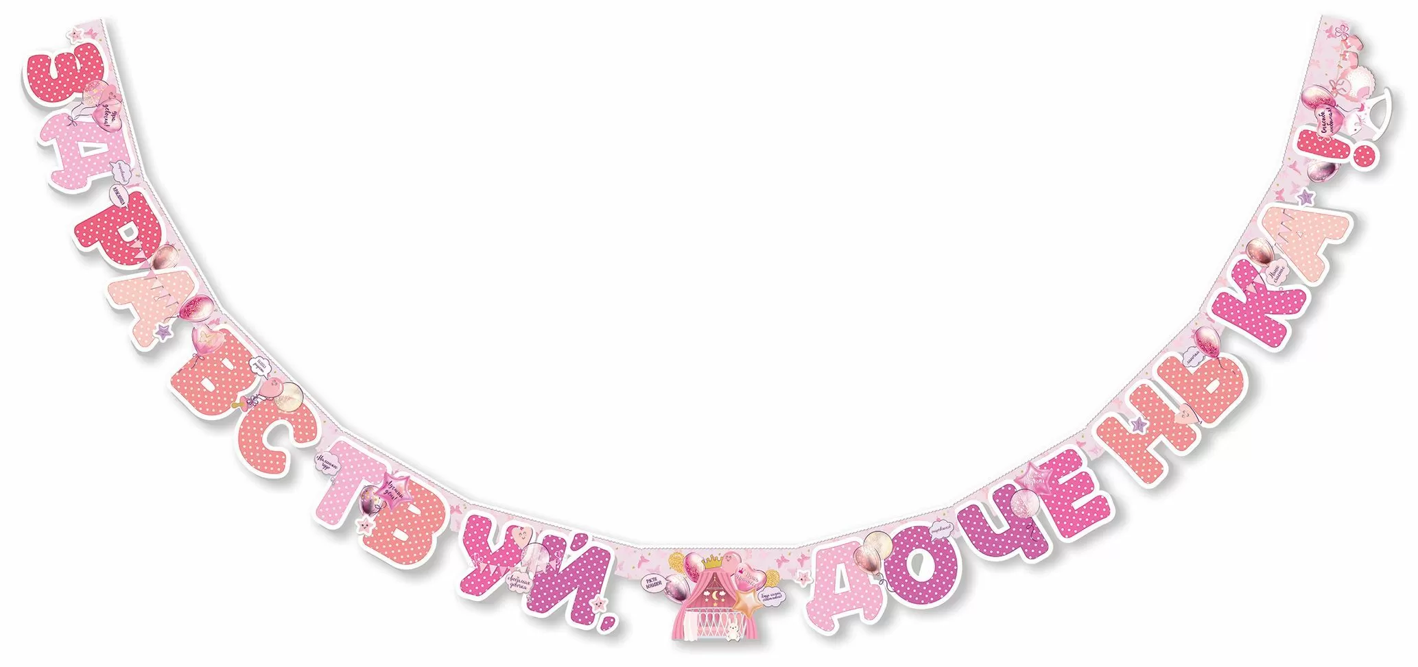 Очаровательная гирлянда «Здравствуй, доченька!» поможет организовать праздник по случаю рождения дочки. Гирлянда украсит гостиную, спальню или зону детской кроватки. Милый дизайн в нежно-розовых тонах подчеркнет особый трогательный смысл события. Отличный вариант для оформления фотозоны!