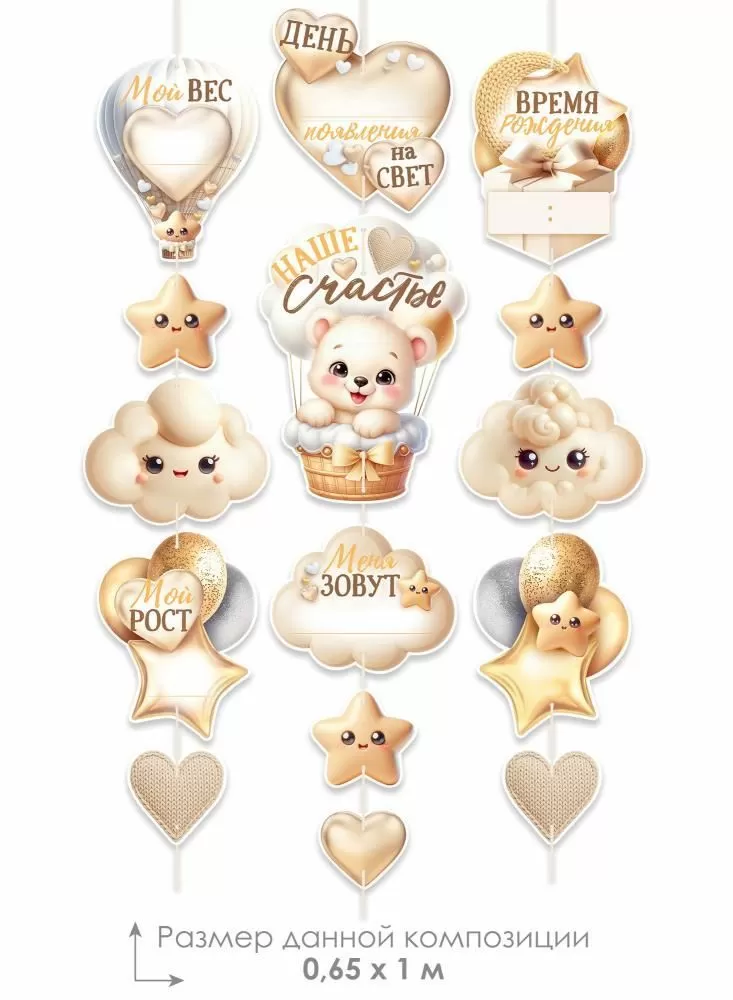 Гирлянда-метрика «Наше счастье!» (медвежонок в корзине воздушного шара, облака, звезды, сердца)