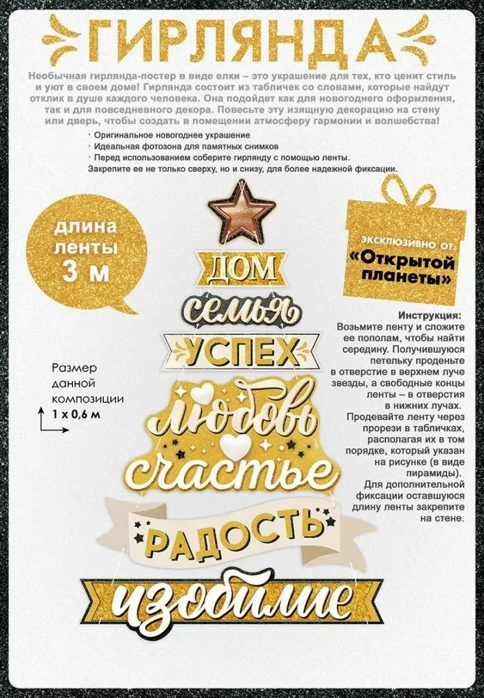 В комплекте 7 картонных деталей и атласная лента длиной 3 м. Перед использованием необходимо собрать украшение. Для этого нужно сложить ленту по полам, продеть получившуюся петельку в отверстие на конце звезды. Оставшиеся свободные части ленты нужно продеть в отверстия на картонных деталях! Детали нужно расположить как показано на упаковке. Материал: плотный картон.