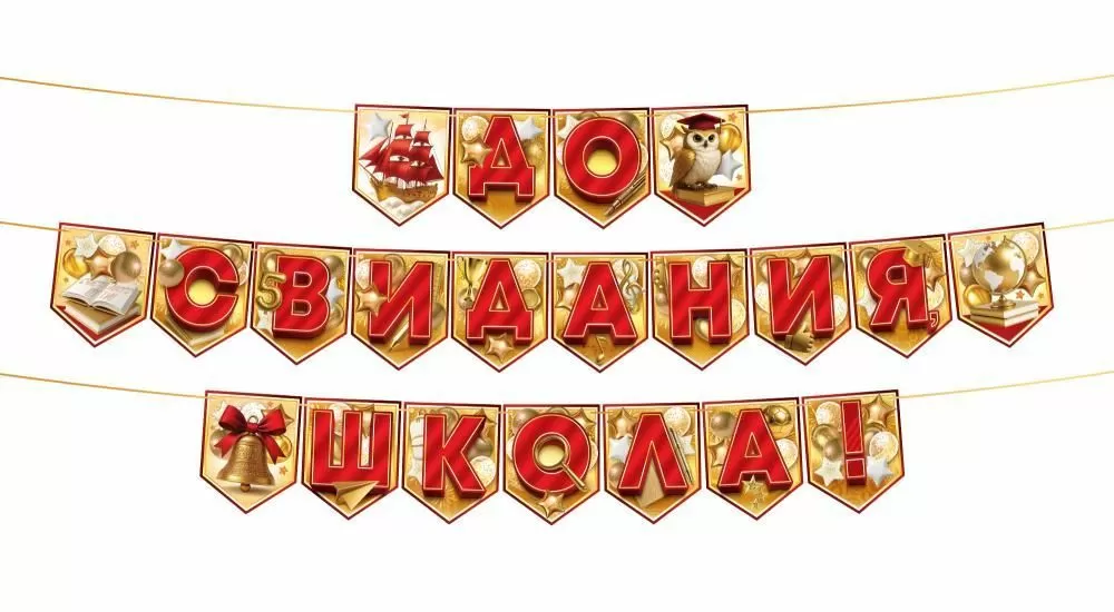 Гирлянда «До свидания, школа!» на флажках (корабль, сова, колокольчик, книги, воздушные шары)
