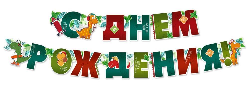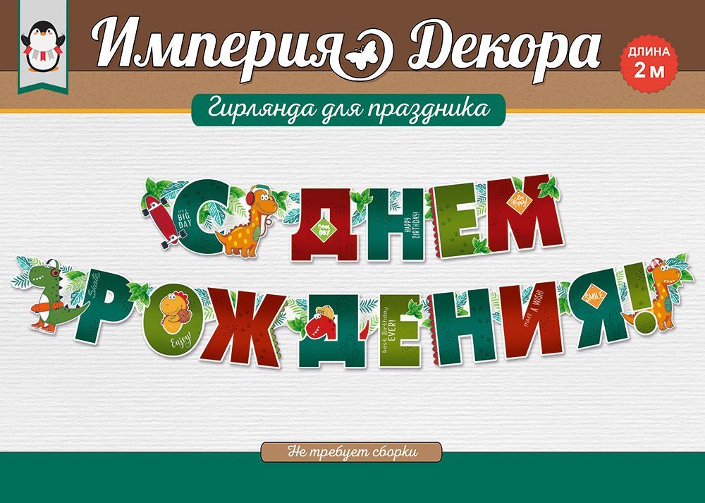 Гирлянда состоит из отдельных элементов, соединенных пикколо — маленькими колечками. Такое соединение делает украшение подвижным. Надпись выполнена оригинальным шрифтом и украшена яркими рисунками с милыми динозавриками. Изображение покрыто глянцевым УФ-лаком. Покрытие защищает рисунок от повреждений и придает ему глянцевый блеск. Длина гирлянды — 2 м. Материал: плотный картон.