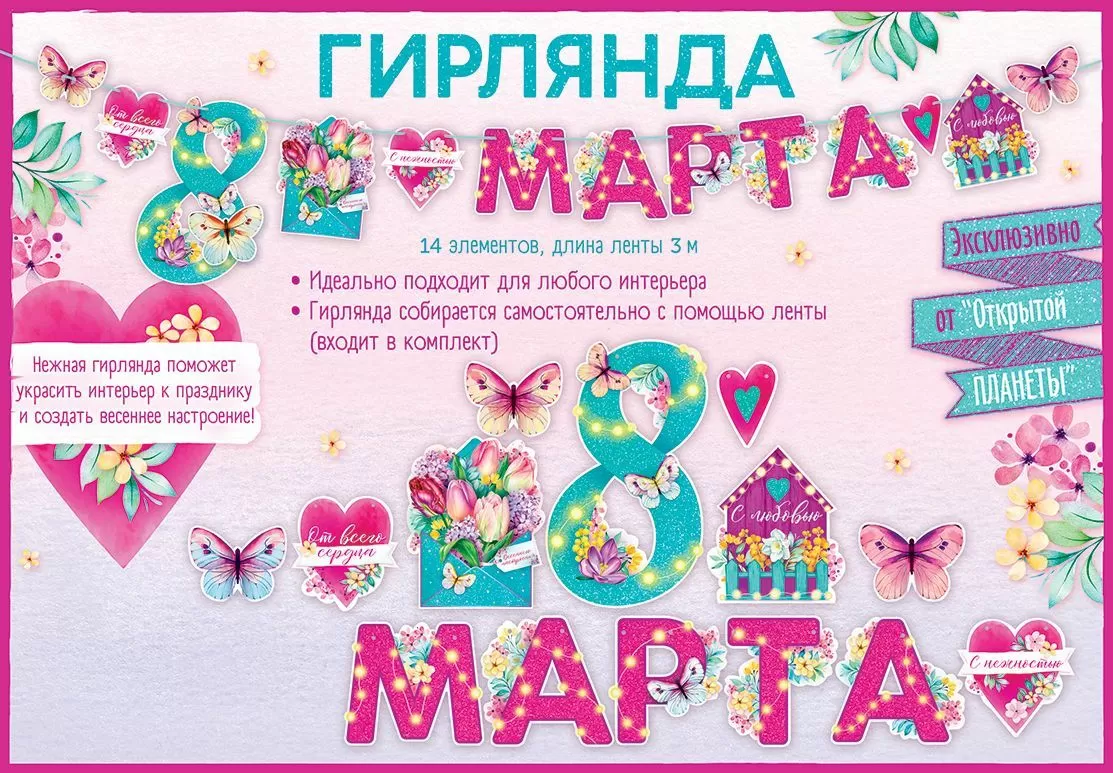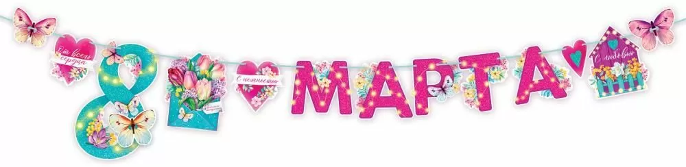 Гирлянда-растяжка «8 Марта!» создаст праздничную весеннюю атмосферу. Гирлянда изготовлена из плотного картона, на который сверху нанесено яркое красочное изображение. Картонное украшение состоит из букв, декоративных элементов и атласной ленты длиной 3 м. Собрать гирлянду очень легко — просто проденьте ленту в отверстия на картонных деталях. Расстояние между элементами можно регулировать. Гирлянду можно повесить на стену, окно или мебель. При этом она достаточна легкая, поэтому для крепления можно использовать обычные булавки, канцелярские кнопки или скотч. К гирлянде по желанию можно подвесить фотографии, открытки и небольшие сувениры. Получится целая поздравительная композиция. С помощью такой растяжки можно создать фотозону и организовать праздничную фотосессию.