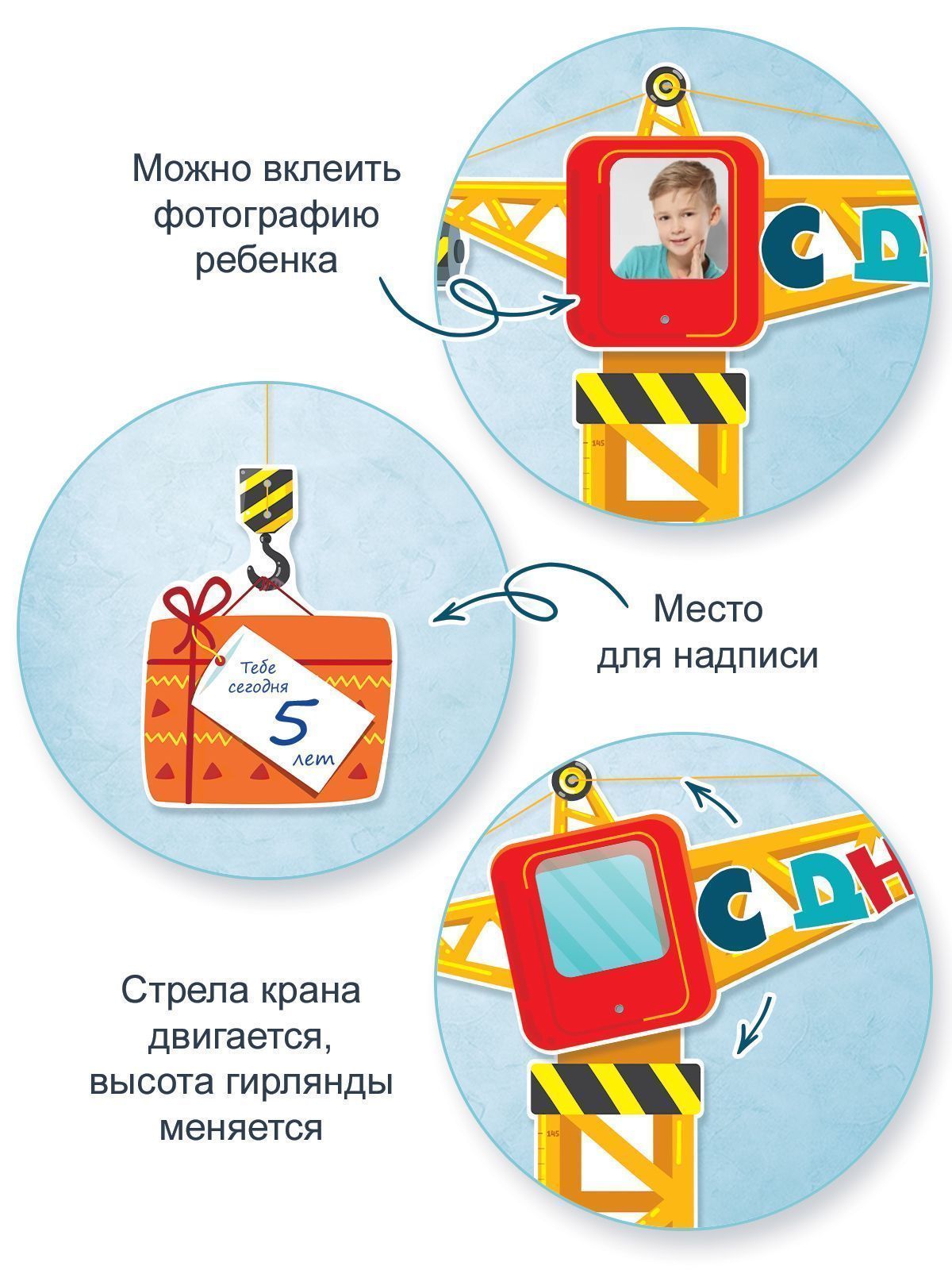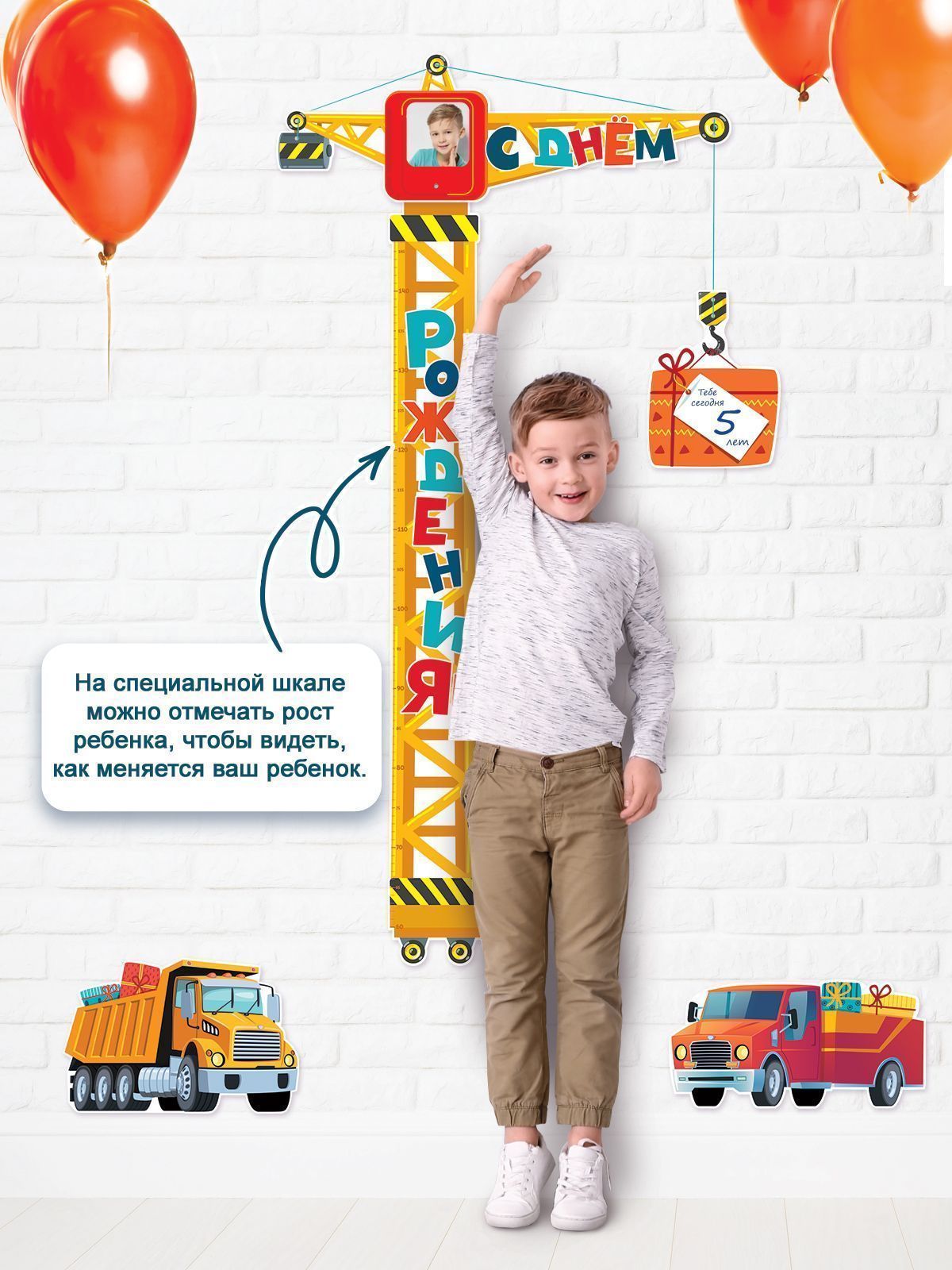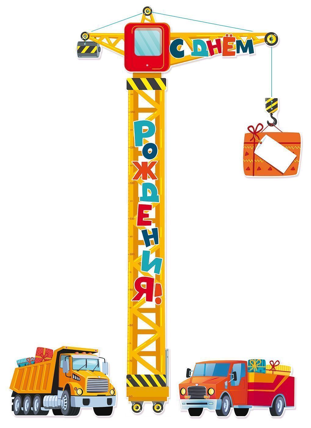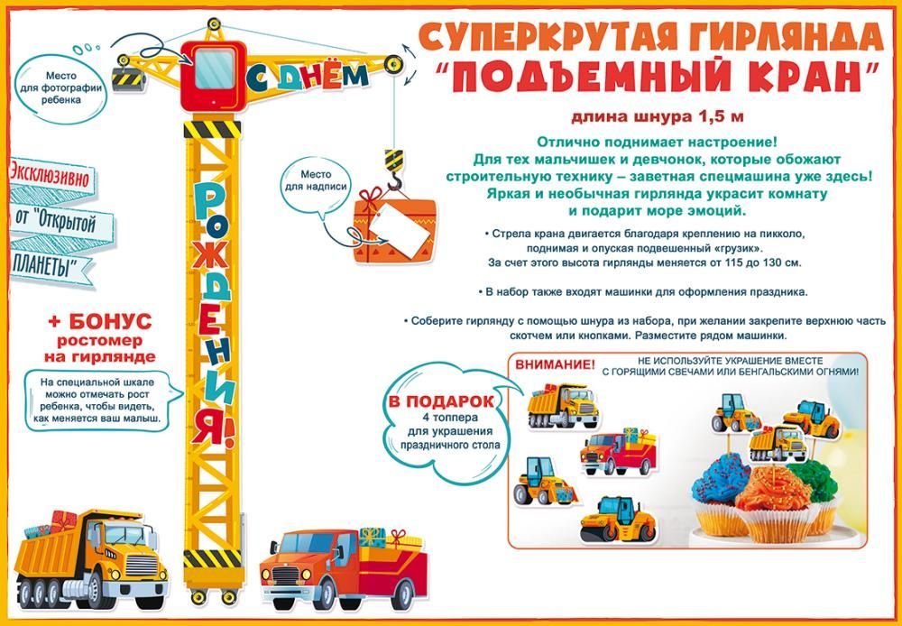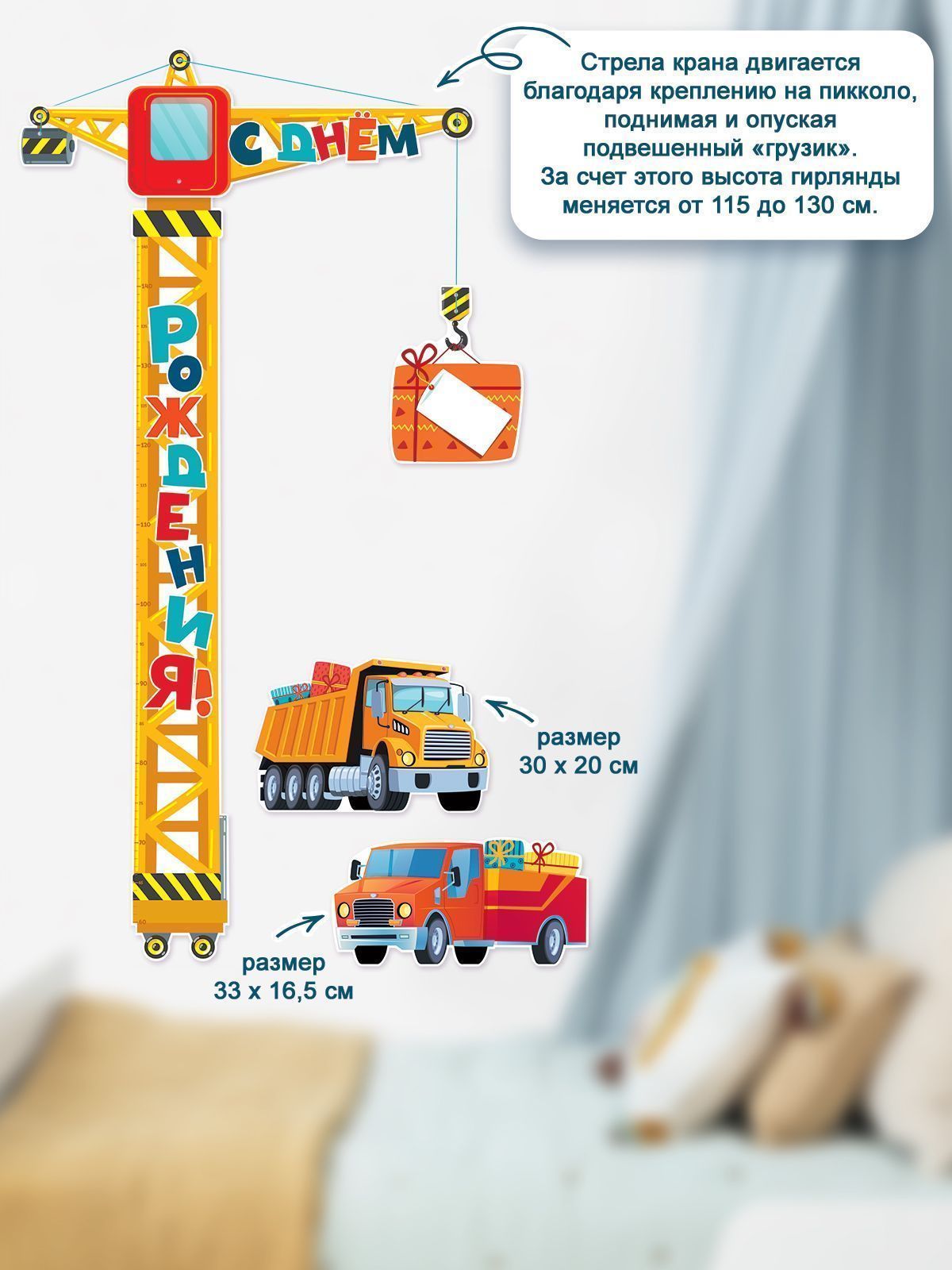 Необычная праздничная гирлянда-ростомер подъемный кран понравится и мальчику, и девочке! Яркая бумажная гирлянда из плотного картона украсит комнату и подарит море эмоций. Это отличный декор для праздника и замечательное оформление фотозоны и интерьера.