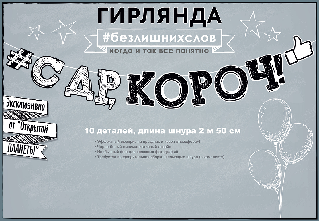 Гирлянда представляет собой набор из 10 отдельных картонных элементов на шнуре, формирующих крупную надпись «#С ДР, КОРОЧЕ!». Изделие выполнено из плотного картона с фигурной вырубкой букв и графических акцентов, что обеспечивает аккуратный контур, стабильную форму и удобство при последующем хранении и многократном использовании. Длина шнура и готового изделия составляет 2500 мм, ориентировочная высота элементов — до 235 мм, что делает надпись хорошо читаемой в помещении среднего и крупного формата: кафе, бар, коворкинг, фотозона, офис, домашняя гостиная. Конструкция на шнуре позволяет регулировать межбуквенные расстояния и общий пролёт, адаптируя гирлянду под ширину стены, витрины или зоны входа. Отделка не применяется, поверхность матовая, без бликов, что удобно для фотосъёмки и оформления фонов, а также снижает риск появления заметных царапин при транспортировке и складском хранении. Чёрно-белое графическое оформление с имитацией меловых надписей на доске хорошо сочетается с нейтральным и тематическим декором, подходит для ассортимента подарочных, праздничных и сувенирных отделов, а также для интернет-продаж, где важно однозначное визуальное восприятие товара. Внутренний текст, кроме основной надписи, отсутствует, что упрощает позиционирование изделия как универсального решения для дня рождения взрослой аудитории, корпоративных мероприятий и неформальных поздравлений. Гирлянда поставляется в количестве 1, компактно упакована, не требует сложных условий хранения, устойчива к кратковременным транспортным нагрузкам в коробах и почтовых отправлениях; для розничного покупателя достаточна базовая сборка — продевание или равномерное распределение уже нанизанных элементов по шнуру и фиксация на стене, дверном проёме или фотозоне с помощью стандартных крепёжных средств.
