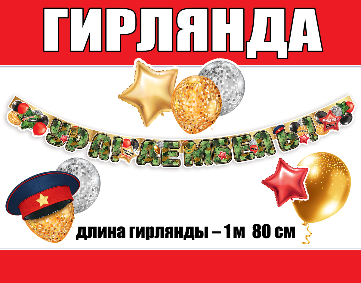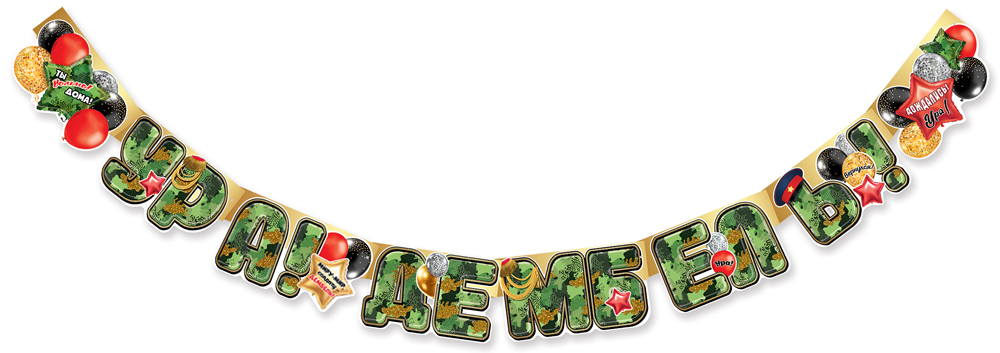 Гирлянда картонная с текстом «Ура! Дембель!» предназначена для оформления помещений к проводам в армию и встрече демобилизованных, а также для тематических военных и патриотических мероприятий. Изделие выполнено из плотного картона с фигурной вырубкой, что обеспечивает аккуратный контур букв и декоративных элементов и позволяет использовать гирлянду как самостоятельный акцент в оформлении. Длина готового изделия составляет 1 800 мм, ширина по наибольшему элементу — 136 мм, что удобно для размещения над столом, в зоне фотосъёмки, у входной группы или на стенде. Конструкция на пикколо с подложкой рассчитана на равномерное распределение нагрузки по всей длине, сохраняет форму при подвесе и облегчает монтаж на стену, витрину или декоративные стойки с помощью стандартных крепёжных материалов. Поверхность дополнительно обработана глянцевым УФ-лаком, который повышает износостойкость, защищает печать от выцветания и истирания, а также улучшает визуальное восприятие за счёт лёгкого блеска, особенно при искусственном освещении в зале или офисе. Цветовая гамма включает камуфляжный рисунок и праздничные элементы, хорошо считывается на расстоянии, что важно при использовании в больших помещениях и на массовых мероприятиях. В упаковке 1 изделие, что удобно для учёта при оптовых закупках и формировании ассортимента: гирлянда может включаться в готовые наборы для оформления праздника или предлагаться как отдельная позиция. Компактный формат и плоская упаковка упрощают хранение на складе, транспортировку и выкладку в розничной зоне, а также позволяют конечному пользователю многократно использовать изделие при бережном обращении.