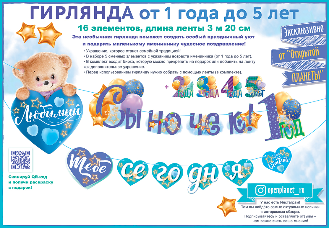 Гирлянда картонная с фигурной вырубкой предназначена для оформления детского праздника по случаю дня рождения мальчика от 1 года до 5 лет. Комплект включает 16 отдельных элементов из плотного картона с полноцветной печатью: крупные фигурные детали с медвежонком и надписями «Любимый сынок», «Тебе сегодня», декоративные сердечки и звёзды, а также сменные элементы с обозначением возраста от 1 до 5 лет, что позволяет использовать изделие многократно для разных дат. Детали рассчитаны на одностороннее размещение, имеют аккуратные контуры и ровные отверстия для продевания ленты, что снижает риск разрывов при сборке и эксплуатации. Длина шнура и готового изделия составляет 3200 мм, максимальная высота центральных элементов — около 370 мм, что обеспечивает хорошую читаемость и заметность надписи в помещении среднего размера. Конструкция предусматривает сборку на атласной ленте, входящей в комплект: лента устойчива к растяжению, позволяет регулировать расстояние между элементами и формировать гирлянду под конкретные размеры стены, фотозоны или торгового пространства. Материал легко выдерживает кратковременное хранение в сложенном виде и транспортировку без деформации при соблюдении базовых условий: защита от влаги, точечные нагрузки и перегибы по рисунку. Изделие подходит для использования в частных интерьерах, детских комнатах, игровых центрах, фотостудиях и в оформлении витрин, позволяя унифицировать праздничное оформление в сети точек продаж. Нейтральная цветовая гамма в сине-голубых тонах и тематические изображения воздушных шаров и звёзд делают гирлянду совместимой с большинством стандартных коллекций шаров и однотонного декора. Оптимальный размер и количество элементов упрощают складской учёт, а возможность повторного применения при бережном обращении повышает экономическую эффективность закупки для оптового клиента. Количество в упаковке: 1.