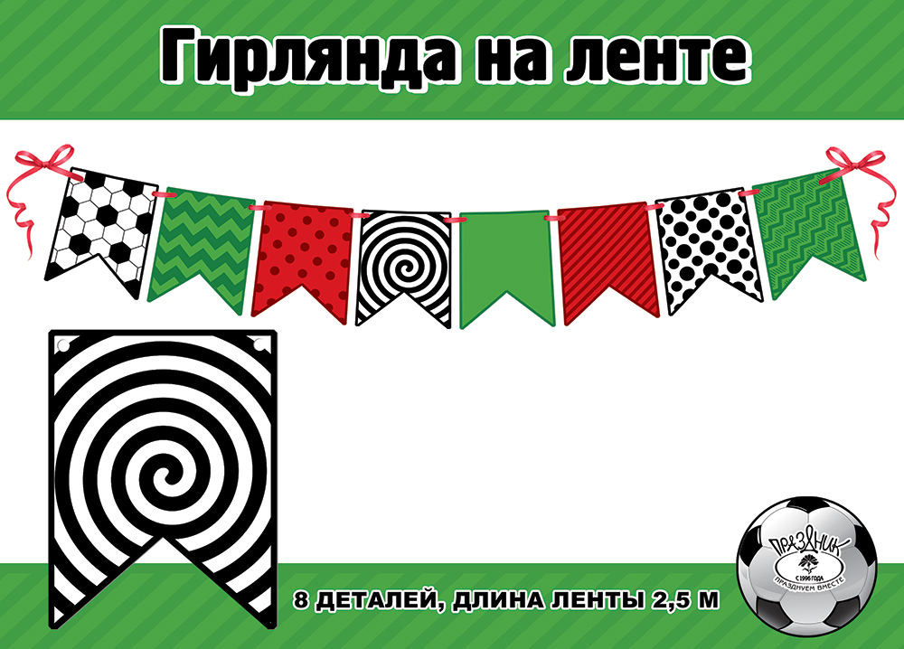 Гирлянда представляет собой готовое к использованию декоративное изделие на ленте длиной 2 500 мм с восемью фигурными элементами из плотного картона. Каждый элемент имеет прямоугольную форму с вырезанным нижним краем и размерами около 207 мм по высоте, что обеспечивает хорошую видимость при оформлении помещений среднего и большого формата. Изображение нанесено с двух сторон, поэтому гирлянда одинаково читается при подвесе в центре зала, в витринах или у входных зон. Применяется офсетная или аналогичная полноцветная печать с чёткими геометрическими орнаментами в чёрно-белой, красной и зелёной гамме, что делает изделие универсальным для спортивных, тематических и общепраздничных мероприятий, оформления детских и подростковых праздников, фотозон, игровых комнат, кафе и клубов. Картон обладает достаточной жёсткостью для сохранения формы при многократном использовании и устойчив к незначительным механическим воздействиям в процессе транспортировки и монтажа. Лента обеспечивает равномерное распределение элементов по всей длине, допускает корректировку расстояния между ними и удобное крепление на стандартные поверхности с помощью скотча, кнопок или подвеса на крючки и растяжки. Конструкция на подложке и ленте компактно складывается, не деформируя детали, что важно для оптовых закупок, складского хранения и перевозки крупными партиями. Нейтральный графический дизайн без текста внутри подходит для комбинирования с другими декоративными позициями ассортимента и не требует привязки к конкретному событию или языку. В упаковке 1.