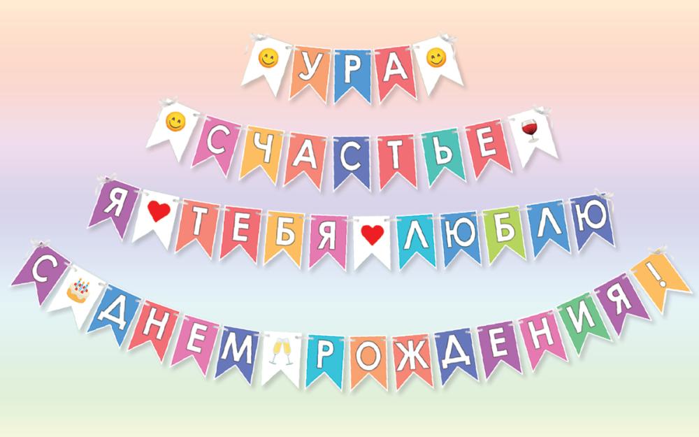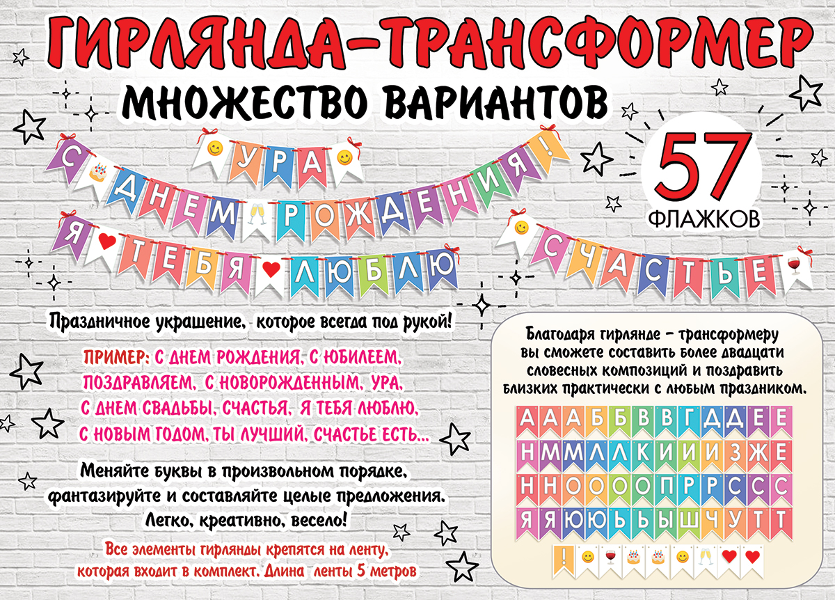 Гирлянда представляет собой модульное декоративное изделие длиной 5 000 мм, состоящее из 57 отдельных элементов на ленте. Основой служит плотный картон с двусторонним изображением, что обеспечивает аккуратный внешний вид при размещении гирлянды в пространстве и позволяет использовать её как у стены, так и в проходах или витринах. Элементы выполнены с фигурной вырубкой и имеют готовые отверстия для продевания шнура, что упрощает сборку и сокращает время подготовки к оформлению. Длина шнура соответствует длине готового изделия и позволяет варьировать расстояние между флажками, подстраивая композицию под ширину помещения, фотозоны, торговой выкладки или входной группы. Конструкция на подложке и ленте удобна для транспортировки и складского хранения: элементы компактно размещены, не деформируются и легко извлекаются по мере необходимости, что важно при серийном использовании в ивент‑агентствах, торговых точках и при работе выездных декораторов. Отсутствие дополнительной отделки снижает риск повреждений при частых монтажах и демонтажах и делает изделие универсальным по стилю, совместимым с разными сценариями оформления. Для розничного покупателя гирлянда может использоваться как базовый комплект для украшения дней рождения, семейных праздников, детских мероприятий и домашних фотосессий: за счёт набора элементов на ленте возможно многократное изменение надписей и композиций, адаптация под конкретный повод и интерьер. Картон устойчив к кратковременному воздействию света и незначительным механическим нагрузкам при аккуратном обращении, поэтому изделие подходит для многократного применения. В упаковке 1.
