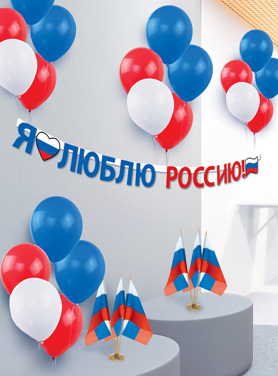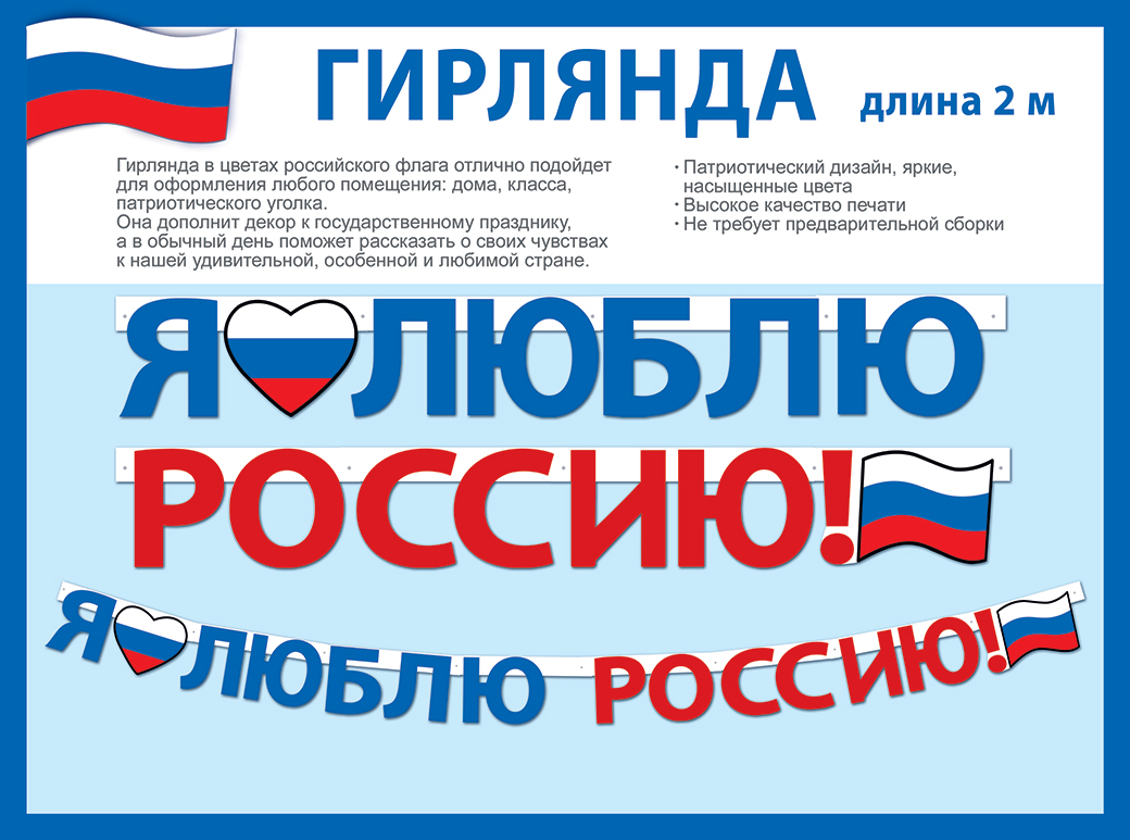Гирлянда картонная длиной 2 м выполнена в формате единого элемента на пикколо-ленте и предназначена для оформления помещений к государственным и патриотическим мероприятиям. Основной декоративный мотив – надпись «Я люблю Россию!» с графическим изображением сердца в цветах российского флага и флаговыми элементами по краям, что обеспечивает однозначное тематическое позиционирование изделия в оформительском ассортименте. Картон достаточной плотности держит форму букв и фигурной вырубки, не деформируется при кратковременном изгибе и допускает многократное использование при аккуратном обращении. Печать яркая, с устойчивыми к выцветанию красками, что важно для декорирования залов, актовых и учебных помещений с интенсивным освещением. Конструкция не требует сборки: все элементы уже закреплены на ленте, поэтому гирлянда готова к монтажу сразу после вскрытия упаковки, что сокращает время подготовки площадки при массовых мероприятиях и упрощает работу персонала. Длина 2 000 мм позволяет использовать изделие как самостоятельный акцент над сценой, доской, входной группой или в витринном оформлении, а также комбинировать несколько гирлянд в линейные и угловые композиции, сохраняя визуальную целостность экспозиции. Ширина готового изделия 131 мм обеспечивает хорошую читаемость надписи с расстояния, при этом гирлянда не перекрывает обзор и не мешает размещению других элементов декора. Изделие поставляется по 1 шт. в упаковке, удобно штабелируется, не занимает много места на складе и в транспортной таре, подходит для планомерных и разовых закупок в учреждения образования, культурные и спортивные организации, торговые сети и компании, оформляющие мероприятия к государственным праздникам, тематическим урокам и патриотическим акциям.