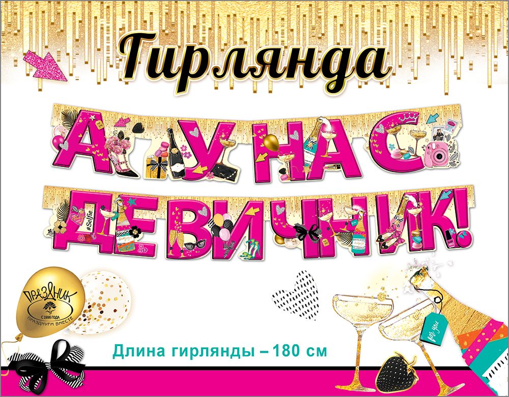 Гирлянда с текстом «А у нас девичник!» предназначена для оформления помещений к предсвадебным и тематическим вечеринкам и ориентирована на использование в событийном и праздничном оформлении. Изделие выполнено из плотного картона с фигурной вырубкой, что обеспечивает аккуратный контур букв и декоративных элементов и позволяет выдерживать многократное использование при бережной эксплуатации. Длина готового изделия составляет 1800 мм, ширина по наибольшему элементу около 136 мм, что удобно для размещения над столом, в фотозоне, у входной зоны или вдоль стены стандартной высоты. Конструкция на пикколо и на подложке обеспечивает ровное расположение элементов, устойчивость к провисанию и упрощает монтаж: гирлянду можно фиксировать на стену, дверной проем, арку, ширму или декоративные стойки с помощью ленты, нитей, канцелярских зажимов. Поверхность дополнительно обработана глянцевым УФ-лаком, который повышает износостойкость, устойчивость к выцветанию и истиранию, а также облегчает сухую очистку от пыли. Отделка подчеркивает яркую цветовую гамму и делает надпись хорошо читаемой на расстоянии, что важно при оформлении залов, фотозон и витрин. Текстовая композиция с крупными буквами и тематическими иллюстрациями ориентирована на использование в современных сценариях декорирования девичников, подходит для кафе, банкетных залов, фотостудий, выездных мероприятий и домашнего праздника. Формат 1,5–1,99 м удобен для складского хранения и транспортировки: изделие поставляется в виде одного элемента, легко складывается до компактного размера, не требует сложной сборки и позволяет быстро оформить площадку перед мероприятием. В упаковке – 1.