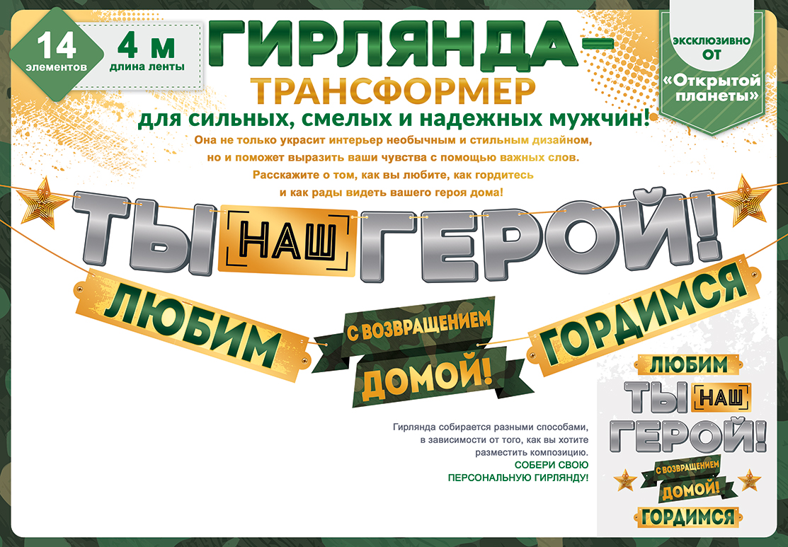 Гирлянда представляет собой набор из 14 картонных элементов на атласной ленте, предназначенный для оформления помещений к встрече военнослужащих и других значимых возвращений домой. Элементы выполнены из плотного картона с фигурной вырубкой, что обеспечивает точную геометрию деталей и аккуратный внешний вид при серийных поставках. Готовое изделие имеет длину 4 000 мм и высоту до 350 мм, что позволяет использовать гирлянду как на небольших площадках, так и в просторных залах; такая длина удобна для стандартных проёмов, стен и фотозон. Конструкция «трансформер» предполагает свободное комбинирование отдельных сегментов с текстом и декоративными вставками: элементы нанизываются на атласную ленту в произвольном порядке, что даёт возможность подстраивать композицию под формат конкретного мероприятия и особенности интерьера. Длина шнура 4 000 мм позволяет регулировать натяжение и провисание, при необходимости гирлянда может монтироваться секционно или с перегибом. Картонная основа оптимальна для оптовых закупок: материал лёгкий, не создаёт значительной нагрузки на крепёж, не требует сложных условий хранения, устойчив к кратковременным деформациям и сохраняет форму при аккуратной эксплуатации. Поверхность рассчитана на многократное использование в помещениях, не выцветает при стандартном искусственном освещении и не даёт бликов на фотографиях. Гирлянда поставляется в количестве 1, что удобно для поштучного учёта, формирования наборов и комбинирования с другой праздничной продукцией в ассортименте. Изделие подходит для оформления квартир, офисов, классов, залов ожидания и тематических площадок, легко монтируется на скотч, кнопки или декоративные подвесы, компактно складывается после мероприятия и может храниться до следующего использования без потери потребительских свойств.