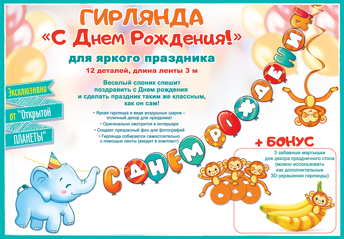 Гирлянда представляет собой готовое к использованию декоративное изделие для оформления детских и семейных праздников, в первую очередь дня рождения. Основа выполнена из плотного картона, устойчивого к деформации при подвешивании и многократном использовании, что важно при серийном применении в праздничном оформлении. Конструктивно гирлянда собрана на атласной ленте длиной 3 000 мм, на которую нанизаны 15 отдельных элементов. Длина готового изделия также составляет 3 000 мм, ширина по максимальному габариту достигает 400 мм, что позволяет планировать размещение в зальных и домашних интерьерах с учётом размеров стены, витрины или фотозоны. Элементы имеют фигурную вырубку с закруглёнными контурами, что снижает риск заломов по углам и повышает аккуратность внешнего вида. Изделие поставляется в количестве 1, удобно для поштучного розничного отпуска и формирования мелкооптовых витринных наборов. Гирлянда не содержит печатного текста внутри элементов и может сочетаться с любыми тематическими надписями, плакатами и шарами, обеспечивая универсальность ассортимента для оптового заказчика. Атласная лента служит одновременно несущей основой и декоративным элементом, не требует дополнительного крепёжного шнура и допускает лёгкую подрезку или изменение расстояния между картонными деталями в зависимости от формата площадки. Небольшой общий вес облегчает транспортировку крупными партиями, снижает нагрузку на упаковку и упрощает хранение на складе и в торговом зале. Для конечного пользователя изделие монтируется стандартным способом: гирлянда фиксируется на стене, двери, витрине или над праздничным столом при помощи скотча, кнопок или подвеса на существующие крючки, образуя яркий фоновый декор для фотографий и зоны поздравлений.