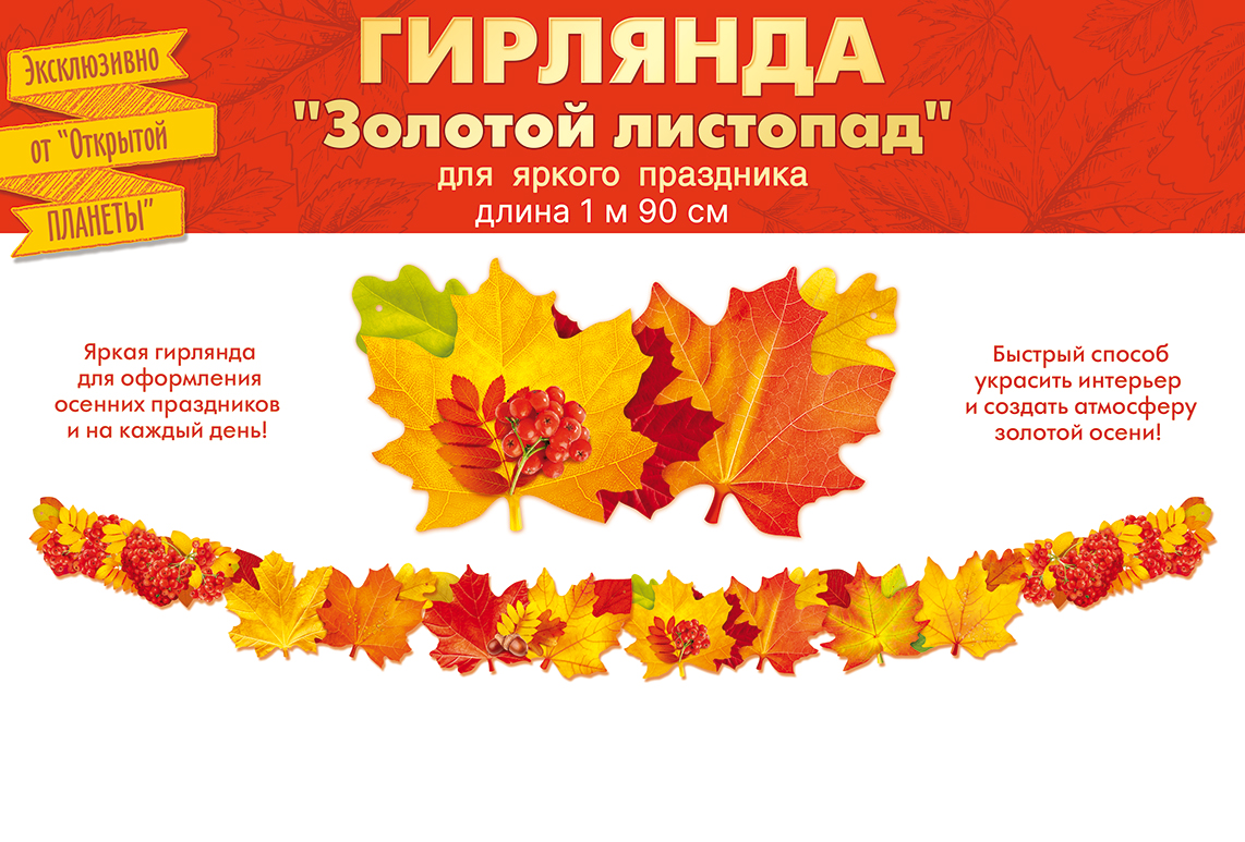 Гирлянда картонная длиной 1900 мм и шириной 174 мм представляет собой единое декоративное изделие с фигурной вырубкой в виде осенних листьев и гроздей рябины в тёплой жёлто‑красной гамме. Конструкция на пикколо обеспечивает равномерное распределение элементов по всей длине и удобство крепления к стенам, витринам, дверным проёмам и другим поверхностям. Материал — плотный картон, рассчитанный на многократное использование при аккуратной эксплуатации в помещениях; он сохраняет форму, не провисает и обеспечивает стабильный внешний вид композиции в течение всего срока мероприятия. Печать полноцветная, с чёткой прорисовкой деталей, что важно для оформления витрин, залов, классов, торговых и офисных пространств, где требуется визуально выразительный, но при этом технологичный и легко монтируемый декор. Отсутствие текста внутри делает гирлянду универсальной для различных форматов мероприятий: сезонное оформление магазинов и кафе, оформление школьных и дошкольных учреждений к началу учебного года, тематические осенние фотозоны, домашние праздники и корпоративные встречи. Одно изделие в упаковке упрощает учёт и планирование закупок в оптовом сегменте, позволяет точно рассчитывать необходимое количество единиц на конкретный объект или сеть точек. Гирлянда поставляется в готовом виде, не требует дополнительной сборки, легко транспортируется и компактно хранится, что снижает затраты на логистику и складирование. При настенном или подвесном размещении рекомендуется использовать стандартные канцелярские или торговые крепёжные решения, не повреждающие картон и позволяющие при необходимости демонтировать и повторно использовать изделие.