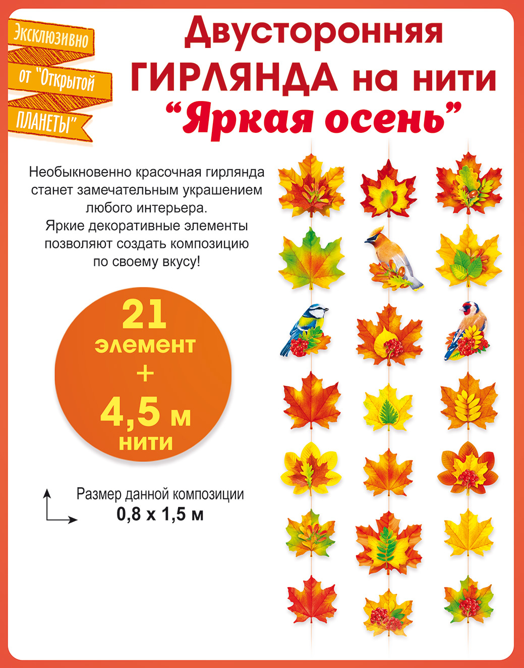 Гирлянда «Яркая осень» представляет собой готовое декоративное изделие длиной 4500 мм и шириной около 140 мм, состоящее из 21 фигурного элемента на шнуре. Основой служит плотный картон с полноцветной двусторонней печатью, что обеспечивает одинаково выразимый вид при обзоре с любой стороны и позволяет использовать гирлянду как в центре помещения, так и у окон или проёмов. Элементы выполнены в виде осенних листьев и птиц, имеют аккуратную фигурную вырубку без внутренних текстов и лишних надписей, что облегчает комбинирование с другими сезонными украшениями и не ограничивает тематику мероприятий. Конструктив с уже продетой ниткой упрощает монтаж: гирлянда сразу готова к подвешиванию, при необходимости элементы можно сдвигать по шнуру, изменяя плотность композиции и общую длину рабочей части. Материал подобран с учётом серийного использования: картон сохраняет форму, устойчив к деформации при аккуратной транспортировке и хранении, не требует дополнительных усилий по подготовке к эксплуатации. Размер 4,5 м удобен для оформления стен, фотозон, сцены, классных досок, витрин и входных групп; при оптовых закупках несколько одинаковых гирлянд легко стыкуются в единую линию для перекрытия протяжённых пространств. Отделка печати обеспечивает чёткую прорисовку деталей и стабильность цветового решения в рамках партии, что важно при формировании унифицированной ассортиментной матрицы для магазинов, школьных учреждений, домов культуры и развлекательных центров. В розничном использовании изделие подходит для сезонного декора дома, детских комнат и праздников, не требует специальных крепёжных систем и может фиксироваться стандартными канцелярскими или декоративными средствами. Количество в упаковке: 1.