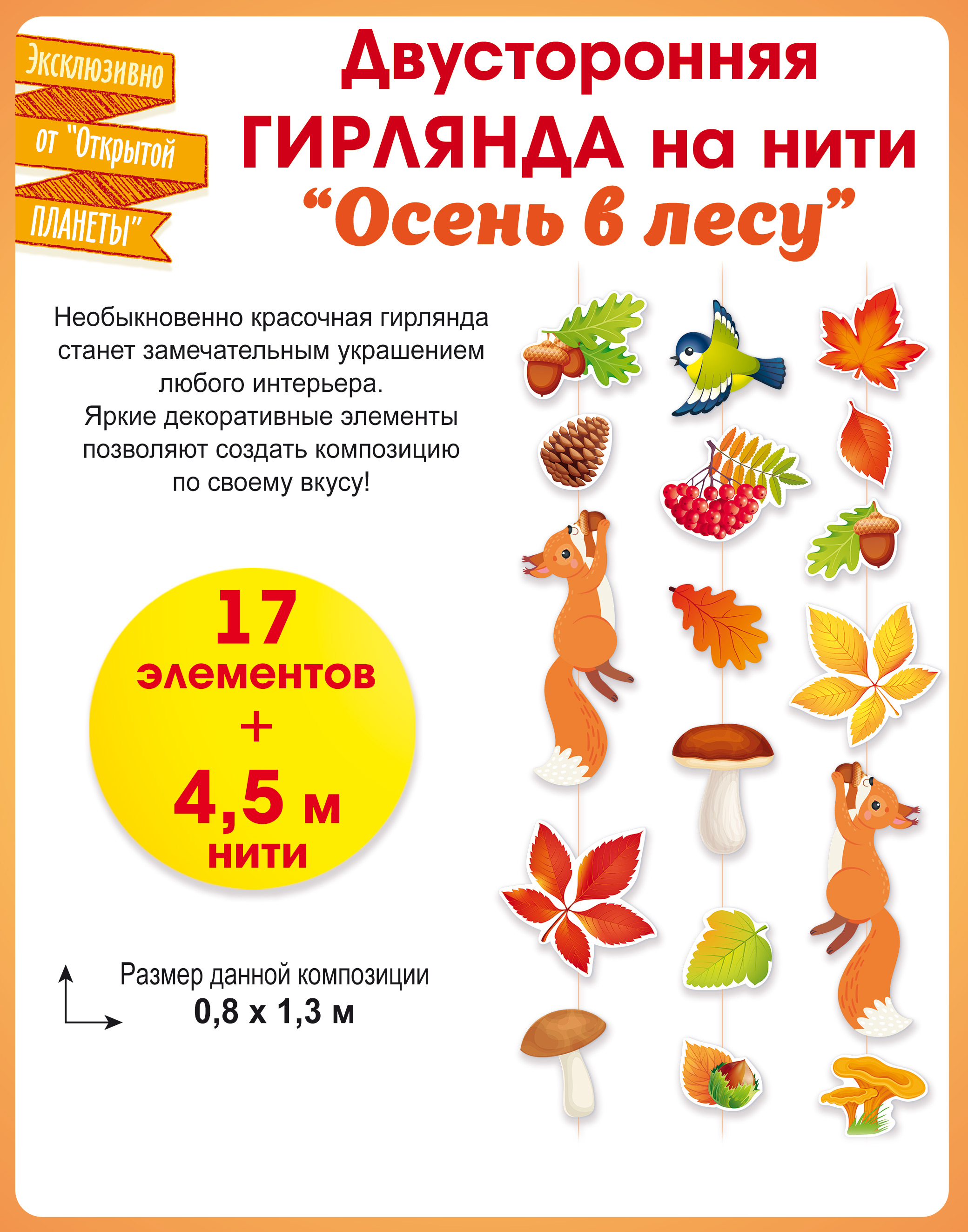 Гирлянда «Осень в лесу» представляет собой готовое декоративное изделие длиной 4500 мм из плотного картона с фигурной вырубкой элементов и шнуром такой же длины для подвеса. В наборе 17 двусторонних картонных фигур с осенней тематикой, распределённых по всей длине нити, что обеспечивает равномерное заполнение пространства и удобство при оформлении больших площадей. Картон обладает достаточной жёсткостью для сохранения формы при длительном вертикальном подвесе, не деформируется при аккуратной транспортировке и многократном использовании, что важно при оптовых закупках для серийного декорирования помещений. Ширина готового изделия составляет 172 мм, что позволяет комбинировать несколько гирлянд в единой композиции без излишней нагрузки на интерьер. Конструкция с ниткой упрощает монтаж: гирлянду можно крепить к стенам, потолку, оконным и дверным проёмам, использовать над сценой, в фотозонах и витринах. Отсутствие текста внутри делает оформление универсальным для детских и семейных мероприятий, сезонных акций, школьных и дошкольных учреждений, развлекательных центров и торговых залов. Яркая двусторонняя печать обеспечивает читаемость рисунка с обеих сторон, что удобно при размещении в проходных зонах и у витрин, где гирлянда просматривается круговым потоком посетителей. Изделие поставляется в количестве 1, удобно хранится в плоской упаковке, не требует специальных условий и может использоваться как самостоятельный элемент оформления или в составе комплексного сезонного декора.