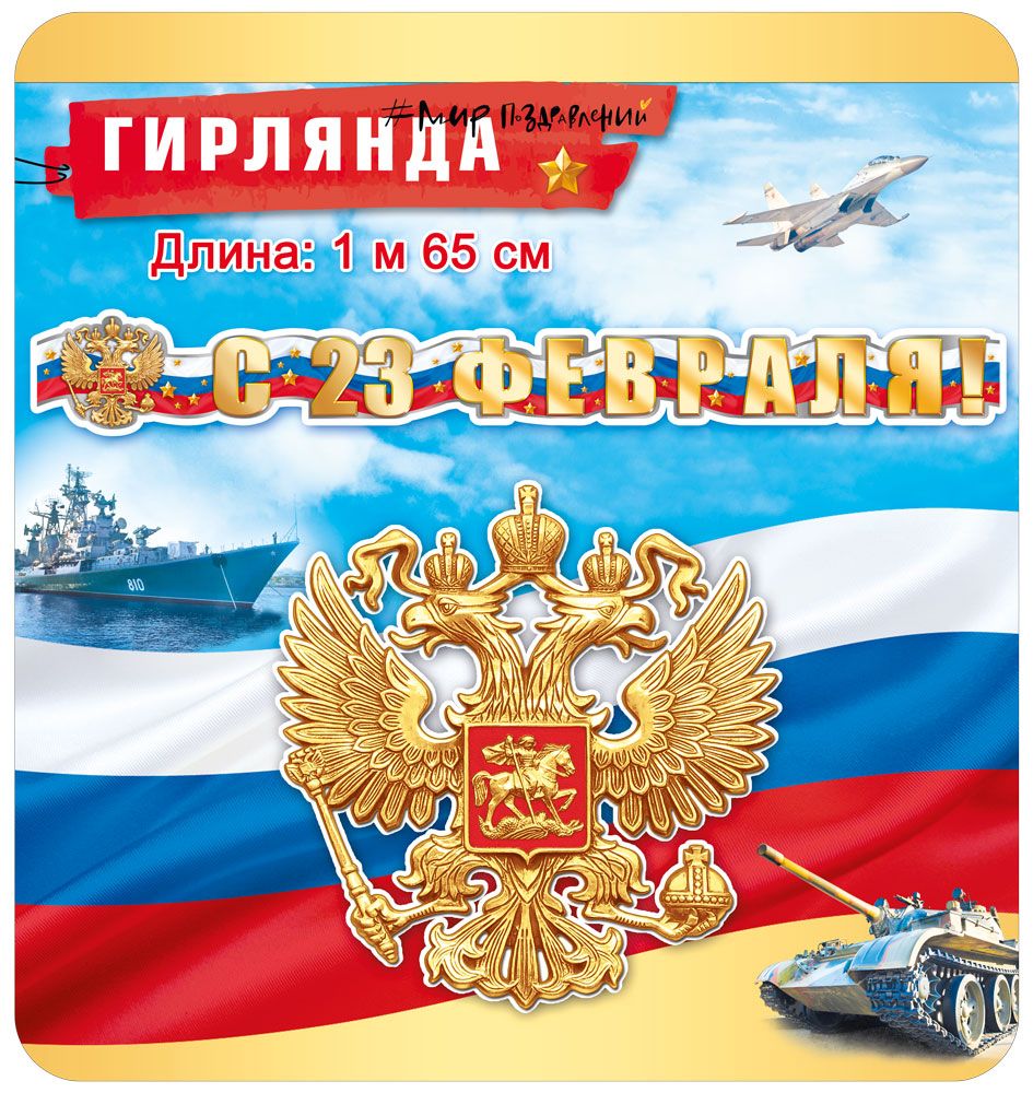 Гирлянда представляет собой одноэлементное декоративное изделие из плотного картона с фигурной вырубкой, выполненное в горизонтальном формате длиной 1650 мм и шириной 145 мм. Конструкция на пикколо обеспечивает жесткость и стабильность формы по всей длине, что важно при оформлении витрин, торговых залов, офисных пространств и зон проведения мероприятий. На лицевой стороне размещена крупная надпись «С 23 ФЕВРАЛЯ!» на фоне ленты в цветах российского флага и декоративных звезд, слева дополненная изображением государственного герба, что делает гирлянду визуально заметной даже с большого расстояния и подходит для тематического оформления ко Дню защитника Отечества. Материал подобран с учетом серийного использования: картон сохраняет геометрию при подвесе, не деформируется при кратковременном воздействии влаги и выдерживает многократный монтаж и демонтаж при аккуратной эксплуатации. Печатное изображение выполнено полноцветно с четкой прорисовкой деталей, поверхность устойчива к истиранию при обычном обращении и не требует дополнительной отделки. Габариты позволяют использовать гирлянду как самостоятельный акцент над входной группой, сценой, ресепшеном, в учебных заведениях или небольших торговых точках, а также комбинировать с другими декоративными элементами в единой праздничной экспозиции. Изделие поставляется по 1 шт. в упаковке, удобно штабелируется, не занимает много места на складе и в транспортной таре, что упрощает планирование запасов и логистику при оптовых поставках на сезонные акции и корпоративные мероприятия, а конечному пользователю обеспечивает простое и быстрое оформление пространства к празднику.