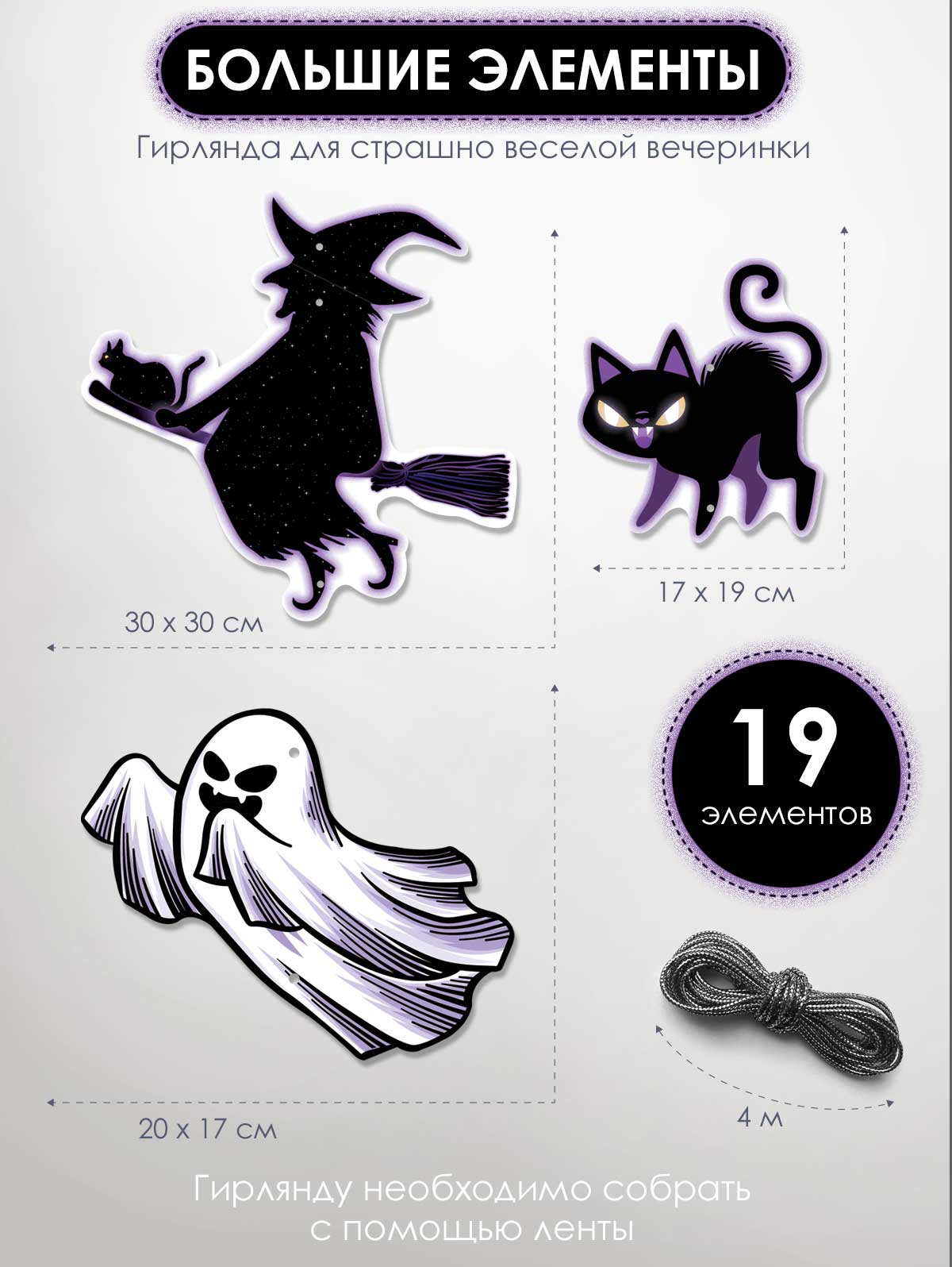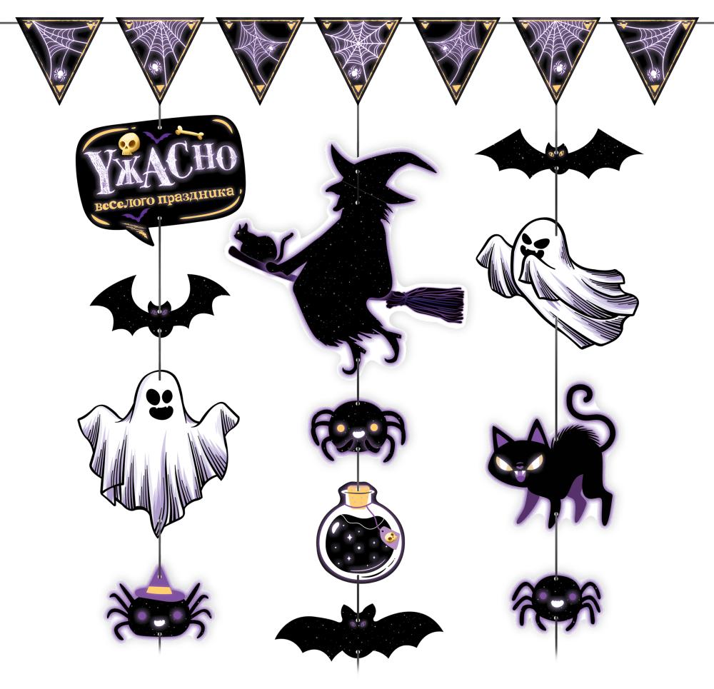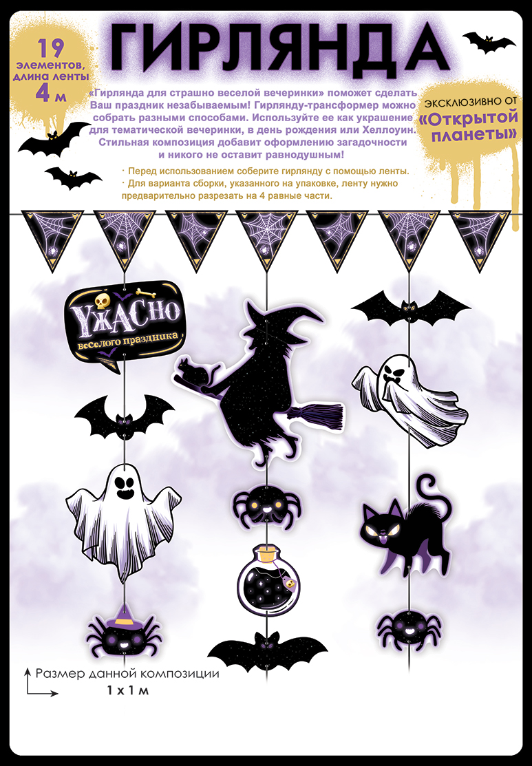 Гирлянда представляет собой набор из 19 фигурных картонных элементов для оформления праздников в тематике Хэллоуина. Изделие выполнено из плотного картона с полноцветной печатью, элементы вырублены по контуру ведьмы, привидений, летучих мышей, пауков, кота, флажков и декоративных символов, что обеспечивает аккуратный внешний вид и стабильную форму при подвесе. В качестве основы используется атласная лента длиной 4 000 мм, позволяющая варьировать конфигурацию и расстояние между деталями в зависимости от формата помещения и задачи оформления. Готовая композиция рассчитана на размещение в зоне 1 000 × 1 000 мм, при этом лента может быть разделена на несколько коротких сегментов для зонирования пространства, оформления витрин, фотозон, входных групп и кассовых зон. Материал и конструкция подобраны с учетом кратковременной сезонной эксплуатации в помещениях: картон выдерживает стандартные нагрузки при подвешивании, не деформируется при правильном хранении и транспортировке, элементы компактно укладываются в плоскую упаковку, что удобно для оптовой логистики и выкладки в розничной сети. Отдельные детали не содержат текста, поэтому гирлянда универсальна для использования в разных форматах мероприятий и не требует локализации под конкретные надписи. Нейтральная цветовая гамма с преобладанием черных, белых и фиолетовых оттенков совместима с большинством сопутствующей праздничной продукции и позволяет легко включать изделие в расширенный ассортимент сезонного декора. Оптимальный размер элементов хорошо читается на средней дистанции, подходит для оформления квартир, офисов, кафе, детских и тематических площадок. В упаковке: 1.