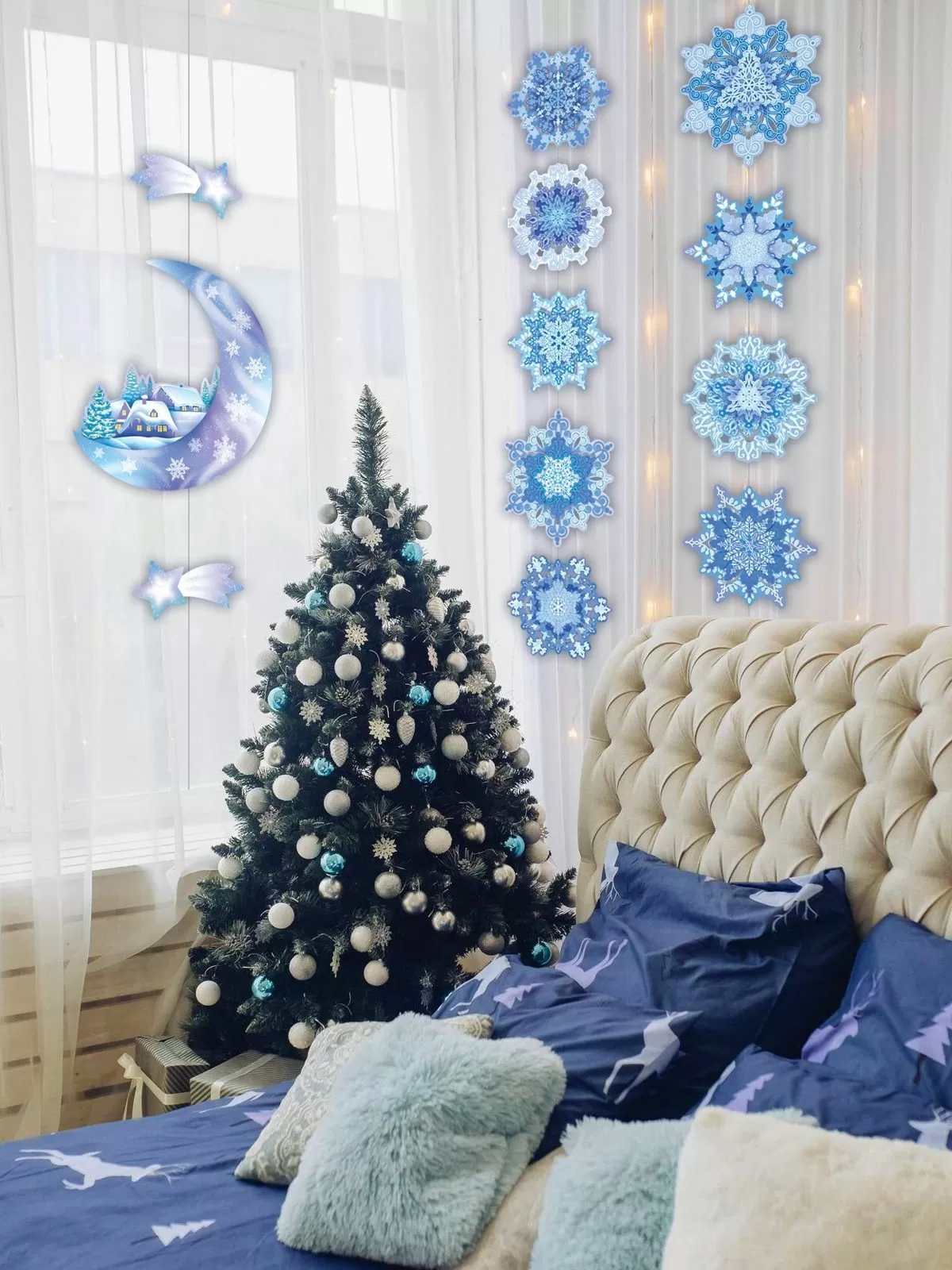 В наборе 13 декоративных элементов из плотного картона: луна, 10 снежинок и 2 звезды, а также серебряная нить 2,5 м. Гирлянду можно повесить горизонтально или вертикально в качестве нескольких подвесов. Перед использованием её необходимо собрать. Для этого нужно отогнуть лучи на снежинках, чтобы придать им объем. Затем по желанию можно разрезать серебряную нить на несколько частей или оставить как есть. Далее необходимо зафиксировать детали на нити.