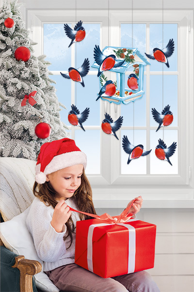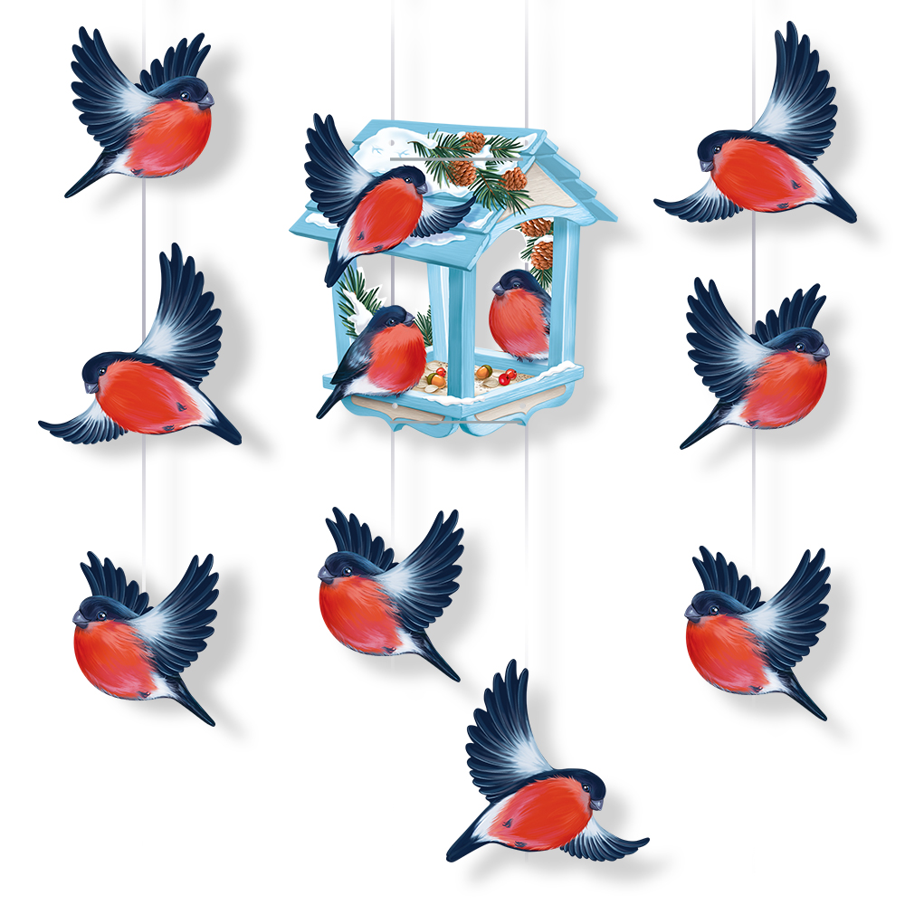 Оформительский набор с вырубными двусторонними плакатами на нитях. В комплект входят 3 отдельных мини-гирлянды с закрепленными на них порхающими снегирями и кормушкой.