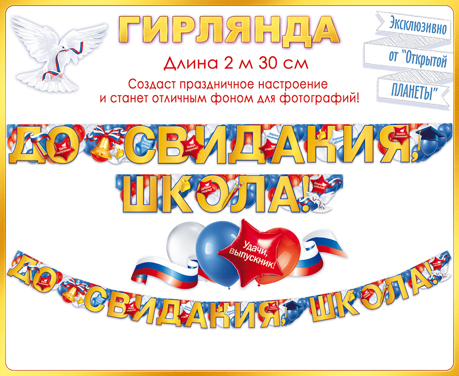 Гирлянда предназначена для оформления выпускных и школьных мероприятий и представляет собой единое декоративное изделие длиной 2300 мм и шириной 133 мм. Конструкция выполнена из плотного картона с фигурной вырубкой, элементы нанизаны на нить по типу «пикколо», что обеспечивает равномерное распределение нагрузки и аккуратную посадку на стене, сцене или в проходе. Плотный картон сохраняет форму при длительной горизонтальной подвеске, устойчив к заломам при аккуратном обращении и выдерживает многократное использование в течение сезона. Поверхность оформлена полноцветной печатью с изображением праздничной композиции и крупной надписью, хорошо читаемой с расстояния и подходящей для фотозон и оформления актовых залов. Яркая графика с использованием контрастных цветов обеспечивает заметность гирлянды на фоне школьного интерьера и сочетаемость с типовыми наборами для выпускных и последнего звонка. Изделие поставляется в собранном виде, что сокращает время подготовки площадки и удобно для массовых монтажей при оформлении нескольких кабинетов или залов; при транспортировке гирлянда компактно сворачивается, не занимая много места на складе и в коробах с сопутствующей праздничной продукцией. Конструкция рассчитана на крепление к стенам, дверным проёмам, шторам или подвесным системам с помощью стандартных канцелярских или монтажных принадлежностей, при этом малая масса уменьшает нагрузку на точки крепления. Формат длины 2–2,49 м позволяет использовать гирлянду как самостоятельный элемент декора или в составе комплексного решения с другими гирляндами и плакатами в единой тематике. В упаковке 1.