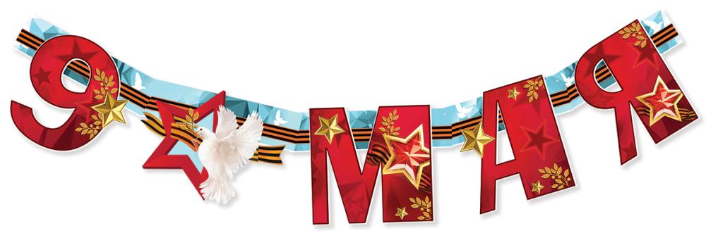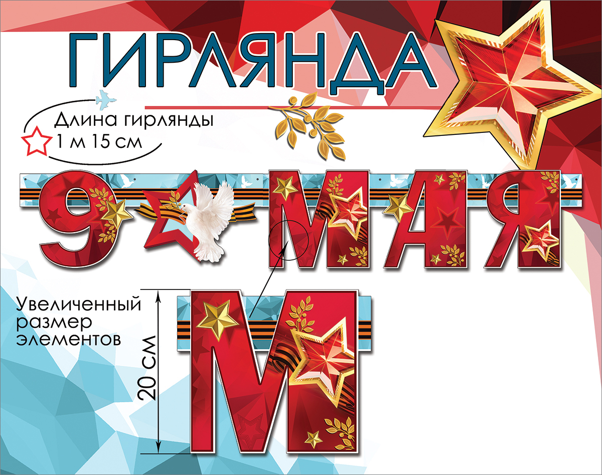 Гирлянда предназначена для оформления помещений и витрин к празднованию 9 Мая и рассчитана на интенсивное использование в торговых и общественных пространствах. Изделие выполнено из плотного картона с фигурной вырубкой отдельных элементов, что обеспечивает чёткий контур цифр и декоративных деталей и облегчает визуальное восприятие с расстояния. Конструкция на пикколо, на подложке, позволяет удобно размещать гирлянду на стенах, витринах, над входными группами и сценическими конструкциями, снижая риск деформации при монтаже и демонтаже. Готовое изделие имеет длину 1150 мм и высоту элементов около 200 мм, что делает композицию хорошо читаемой в средних и крупных помещениях и позволяет использовать её как самостоятельный акцент или в составе комплексного праздничного оформления. Поверхность украшена глянцевым УФ-лаком, который повышает износостойкость, защищает печать от выцветания и истирания, облегчает сухую очистку от пыли, а также придаёт изображению более выраженную цветовую насыщенность при искусственном и дневном освещении. Дизайн выдержан в тематике Дня Победы: крупная надпись «9 МАЯ», звёзды, лавровые ветви, георгиевская лента и белый голубь формируют законченный визуальный образ, подходящий для школ, офисов, торговых залов, домов культуры и частных интерьеров. Формат длиной 1–1,49 м удобен для тиражного использования в сетевых магазинах и организациях: гирлянда легко комбинируется с другими элементами декора, не требует сложных креплений, компактно размещается при транспортировке и хранении. Картонный материал совместим с большинством стандартных способов крепления — скотчем, кнопками, клипсами, что упрощает монтаж персоналом без специальной подготовки. В упаковке 1.