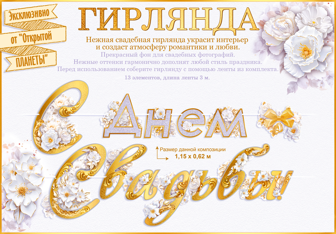 Гирлянда предназначена для оформления свадебных залов, фотозон и входных групп и представляет собой набор из 13 фигурных картонных элементов с декоративным оформлением в светло-белой и золотистой гамме. На элементах сформирована композиция поздравительной надписи, дополненная цветочными мотивами и декоративными акцентами, что позволяет использовать изделие как самостоятельный центр композиции при оформлении пространства. Основной материал – плотный картон, устойчивый к деформации при кратковременной транспортировке и хранении в горизонтальном положении; поверхность обладает печатным рисунком с четкой прорисовкой деталей, рассчитанным на визуальное восприятие с расстояния, характерного для банкетных залов и фотозон. Готовое изделие имеет длину около 3000 мм и высоту до 305 мм, что удобно для размещения над столом молодых, на стене за спинками стульев, над аркой или в витринных композициях. Конструкция предусматривает монтаж на атласную ленту длиной 3000 мм, входящую в комплект, что облегчает сборку, позволяет регулировать расстояние между элементами и подстраивать общую ширину композиции под конкретную площадку. Изделие поставляется в количестве 1, рассчитано на однократное или кратковременное многократное использование при аккуратной эксплуатации в помещениях, не подверженных повышенной влажности. Для оптовых закупок гирлянда удобна стандартизированными размерами, стабильным качеством печати и единым цветовыми решением, что облегчает формирование ассортимента свадебной категории и комбинирование с другими изделиями аналогичной палитры. Компактная плоская упаковка упрощает транспортировку и складское хранение, позволяет оптимизировать выкладку в торговом зале и использовать товар как базовую позицию для сезонных и постоянных коллекций свадебного декора.
