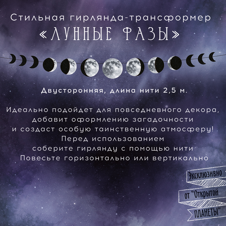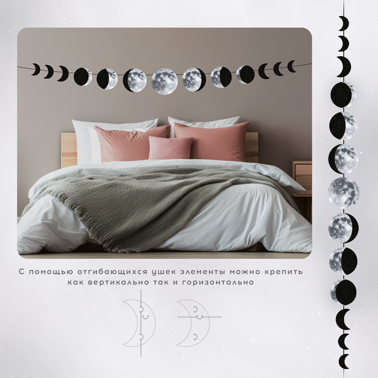 Гирлянда представляет собой декоративное изделие из плотного картона с фигурной вырубкой в виде последовательности лунных фаз, предназначенное для оформления интерьеров жилых и коммерческих помещений. Конструкция включает 13 отдельных элементов шириной до 196 мм, нанизываемых на прилагаемый шнур длиной 2 500 мм; длина готового изделия соответствует длине шнура и позволяет оформлять как небольшие, так и протяжённые участки стены, витрины или фотозоны. Картон обладает достаточной жёсткостью для сохранения формы при подвесе и устойчив к деформации при кратковременных изгибах, что важно при многоразовом использовании и транспортировке в составе оптовых поставок. Отсутствие печатного текста на элементах делает гирлянду универсальной для различных тематик и сезонов, её можно включать в базовый ассортимент декора без привязки к конкретному празднику, комбинировать с другими гирляндами, световыми или бумажными изделиями. Изделие поставляется в количестве 1, что удобно для розничной выкладки и поштучного учёта при формировании крупных заказов. Небольшой вес и плоская упаковка снижают затраты на хранение и логистику, позволяют рационально использовать складское пространство и упрощают пересылку. Для конечного пользователя гирлянда не требует сложной сборки: элементы размещаются на шнуре в произвольном или рекомендованном порядке, после чего композиция крепится к стене, карнизу, стеллажу или фотозоне горизонтально либо вертикально в зависимости от задач оформления. Такое исполнение подходит для повседневного декоративного оформления, тематических вечеров, детских и подростковых комнат, а также для оформления кафе, студий, шоурумов и книжных магазинов, где востребован спокойный, неброский, но визуально структурированный декоративный акцент.