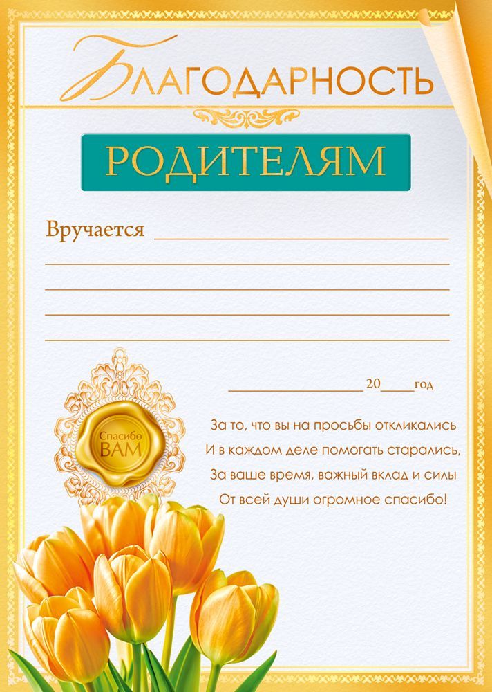 Благодарность формата А4 изготовлена из плотного картона, что обеспечивает жесткость, аккуратный внешний вид и устойчивость к сгибам при стандартных условиях хранения и транспортировки. Размер готового изделия 295 × 210 мм позволяет размещать его в типовых папках, файлах и рамках формата А4, что удобно при формировании архивов и стендов в образовательных организациях и учреждениях дополнительного образования. Оформление выполнено в классическом стиле: светлый фон с декоративной рамкой по периметру, верхняя часть содержит крупную надпись «Благодарность» и поле «Родителям», нижний блок дополнен иллюстрацией тюльпанов и декоративным медальоном с надписью «Спасибо вам». Внутри предусмотрен готовый текст с выражением признательности и рифмованным пожеланием, а также подсказки для заполнения: строки для указания фамилии, имени и отчества получателя, даты вручения и наименования организации или мероприятия. Такое решение сокращает время подготовки к массовым награждениям, упрощает работу организаторов и позволяет поддерживать единый стиль документации при больших тиражах. Плотный картон хорошо держит печать шариковыми и гелевыми ручками, не просвечивает и не коробится при аккуратном заполнении. Изделие удобно использовать при подведении итогов учебного года, родительских собраний, школьных и дошкольных проектов, а также при оформлении благодарственных акций в частных студиях, кружках и центрах развития. Нейтральная, но торжественная цветовая гамма подходит для различных возрастных групп и форматов мероприятий. В упаковке 10 штук, что позволяет планировать закупку под количество групп, классов или мероприятий и оптимизировать складские остатки при регулярном использовании подобных бланков в ассортименте.
