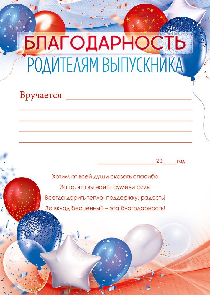 Благодарность формата А4 предназначена для оформления официального выражения признательности родителям выпускника и рассчитана на массовое использование в образовательных организациях. Изделие изготовлено из плотного картона, что обеспечивает достаточную жесткость, устойчивость к сгибам и сохранение формы при хранении и транспортировке в стопках. Готовый размер бланка составляет 295 × 210 мм, что позволяет размещать его в стандартных папках, файлах и обложках для документов формата А4, а также использовать типовые пакеты и конверты при вручении. Лицевая сторона содержит полноцветное оформление с тематикой выпускного: воздушные шары, конфетти и нейтральный торжественный фон, подходящий для школ, детских садов, учреждений дополнительного образования. В верхней части предусмотрен заголовок «Благодарность родителям выпускника», ниже размещены строки для вписывания фамилии, имени, отчества, наименования образовательной организации, даты вручения и подписи ответственных лиц, что упрощает заполнение при большом количестве награждаемых. В центре и нижней части расположен готовый текст благодарности и подсказ по заполнению, что позволяет поддерживать единый стиль оформления документов в рамках одного мероприятия и снижает нагрузку на организаторов при подготовке торжественной части. Плотный картон хорошо держит печать ручкой, маркером или гелевой ручкой без сильного просвечивания с оборота, что удобно при оперативном заполнении непосредственно перед мероприятием. Изделие поставляется в упаковке по 10, что удобно для планирования закупок под количество выпускников и их семей, формирования резерва и включения в комплексные наборы к выпускному вечеру. Благодарность может использоваться как самостоятельный документ, так и в составе папки выпускника, альбома или памятного комплекта, обеспечивая упорядоченный и единообразный вид наградной документации.
