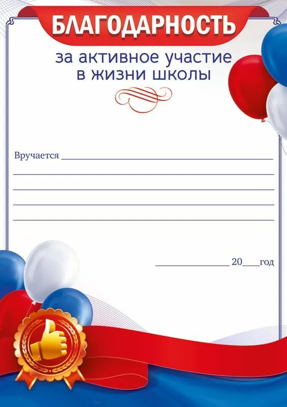 Благодарность формата А5 предназначена для оформления поощрений родителям за активное участие в жизни школы и других образовательных мероприятий. Изделие изготовлено из мелованной бумаги с плотной и гладкой поверхностью, обеспечивающей четкую передачу цветной печати и устойчивость к истиранию при частом перелистывании и хранении в папках или файлах. Габаритные размеры готового бланка составляют 210 × 148 мм, что соответствует стандарту А5 и упрощает подбор конвертов, рамок и файлов-регистраторов при массовом использовании в образовательных учреждениях. Лицевая сторона оформлена в деловом торжественном стиле: в верхней части размещен заголовок «БЛАГОДАРНОСТЬ», ниже предусмотрено текстовое поле «за активное участие в жизни школы» и блок строк для вписывания фамилии, имени награждаемого, формулировки заслуг и подписи ответственных лиц, а также отдельная зона для указания даты вручения. Компоновка макета оставляет достаточно свободного пространства для заполнения вручную шариковой или гелевой ручкой без риска размазывания текста, что важно при оформлении большого количества бланков подряд. Плотность и структура мелованной бумаги позволяют использовать стандартные офисные принтеры для добавления индивидуализированного текста, при этом форма сохраняет геометрию, не коробится и не просвечивает. Цветовое решение с использованием сине-красно-белой гаммы, декоративных воздушных шаров и медали с символом одобрения делает бланк визуально заметным при размещении на стендах, в личных папках достижений и семейных архивах. Упаковка содержит 20 изделий, что удобно для планирования закупок школами, классными руководителями, учреждениями дополнительного образования и организаторами массовых мероприятий, позволяя формировать резерв наградной продукции на учебный год или отдельное мероприятие без лишних остатков. Бланки поставляются без отделки, что облегчает штабелирование, транспортировку и хранение в коробках или на полках, не требуя специальных условий и сохраняя внешний вид при длительном складском хранении.